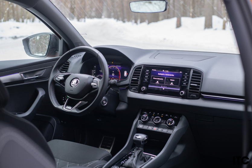 Интерьер Skoda Karoq остается верным немецкому минимализму. Мягкая пластика в верхней части, темная ткань на дверях, черная кожа на руле (в Sportline), небольшой сенсорный экран на 8 дюймов. Это не выглядит современно в 2025 году, но функциональность не вызывает вопросов. Все находится на месте, все доступно, нет рассеивания внимания на оформление. Обновленная панель приемника имеет больше глубины, чем у предыдущих поколений, что расширяет ощущение пространства.