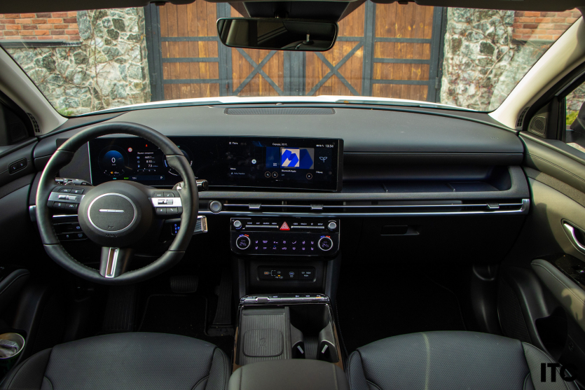 Внутри Hyundai Tucson как всегда задаёт тон современности: новая архитектура салона выглядит взрослой, сдержанно-премиальной, с большим изогнутым блоком двух 12,3-дюймовых экранов и тонким трёхспицевым рулём. Передняя панель отодвинута вперёд, чтобы создать ощущение простора, материалы приятны на ощупь, а общая атмосфера ближе к старшим моделям бренда, чем к доступному кроссоверу. Интерфейс климата и мультимедиа сочетает физические органы управления с сенсорными зонами, обеспечивая относительно интуитивное взаимодействие, а сиденья и общая посадка воспринимаются как комфортные даже на долгих поездках.