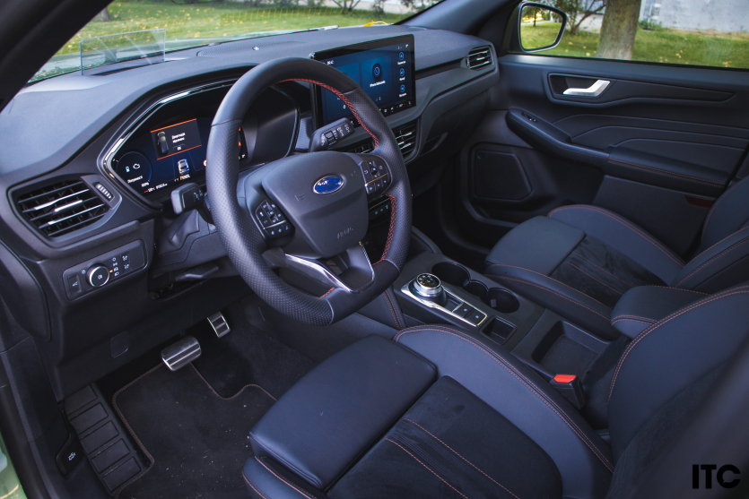 Ford Kuga находится где-то посередине. 13,2-дюймовый экран SYNC 4 хорош, но не прорывной. Система управления логична, хотя и озадачивает в начале. Материалы класса премиум в базовой комплектации, что приятно удивит по сравнению с конкурентами. Внутри Kuga делает ставку на сочетание функциональности и комфорта: высокая посадка, большой центральный экран с новой системой SYNC 4, полностью цифровая панель приборов и аккуратная горизонтальная архитектура торпедо. Однако общее качество пластика ниже, чем у некоторых европейских конкурентов, и не хватает отсутствия отдельных физических клавиш климата — управлять всем через экран не всегда удобно на ходу.