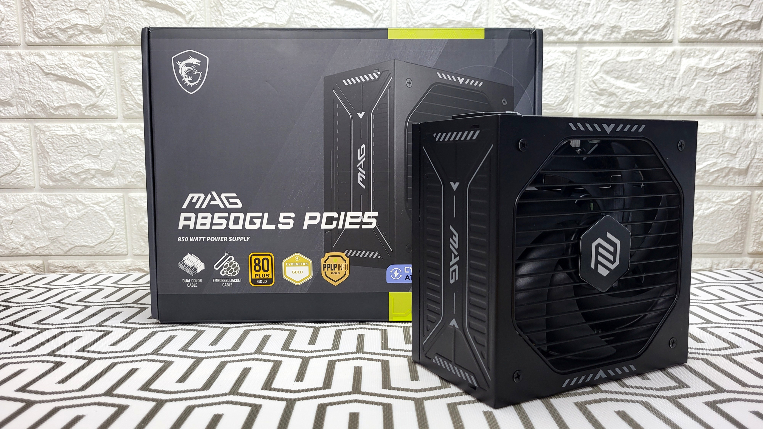 MSI MAG A850GLS PCIE5 прибыл на редакционный обзор в классической черной коробке, украшенной декоративными дизайнерскими вставками. По традиции на ней изображен сам блок питания и перечень основных стандартов и сертификаций, которые им поддерживаются.