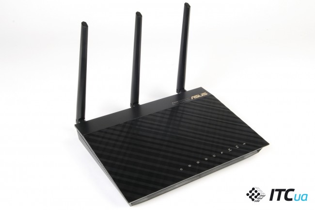 Маршрутизатор с поддержкой Wi-Fi сетей пятого поколения выполнен в том же конструктиве, что и хорошо знакомые пользователям модели ASUS RT-N66U и DSL-N55U. Напомним, что отличительными чертами дизайна данных моделей выступают три съемные антенны, текстурированная верхняя панель корпуса и возможность вертикальной установки роутера с помощью комплектной подставки.