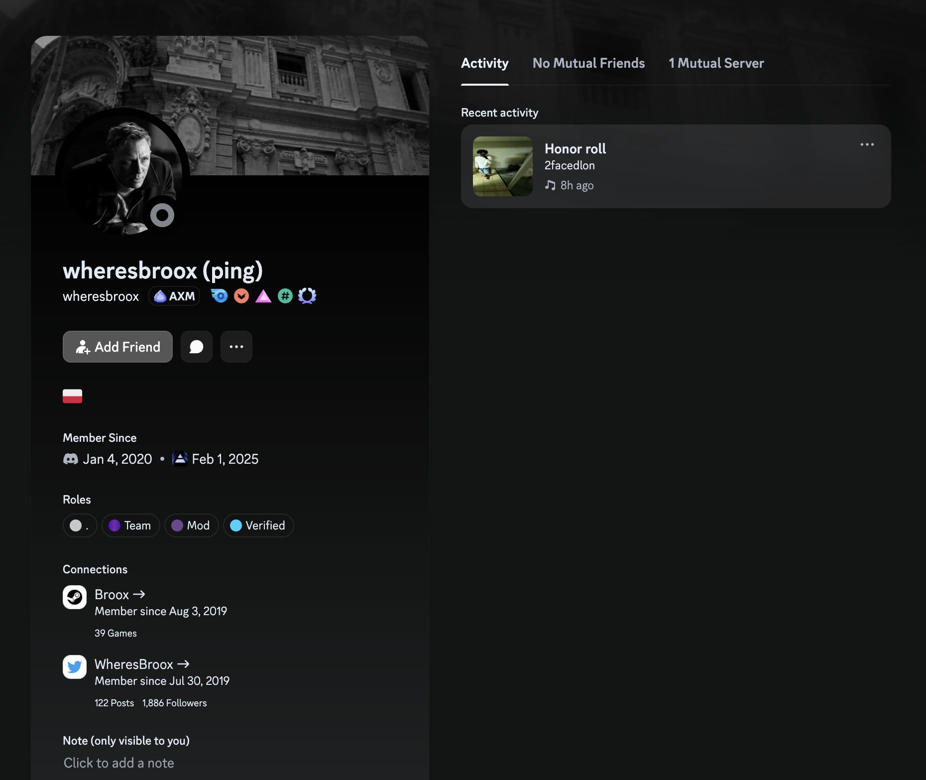 В апреле 2025 года Брукс поделился скриншотом с внутреннего дашборда Axiom, на котором отображались личные кошельки трейдера «Jerry».