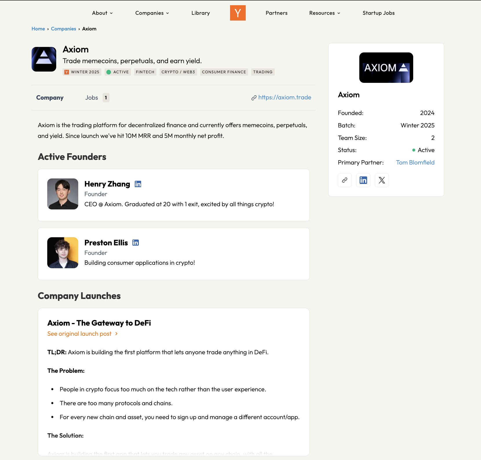 Axiom — это криптоторговая платформа, основанная Mist и Cal в 2024 году. После прохождения зимнего набора Y-Combinator 2025 года она быстро стал одной из самых прибыльных компаний в сфере, сгенерировав более $390 млн дохода на сегодня.