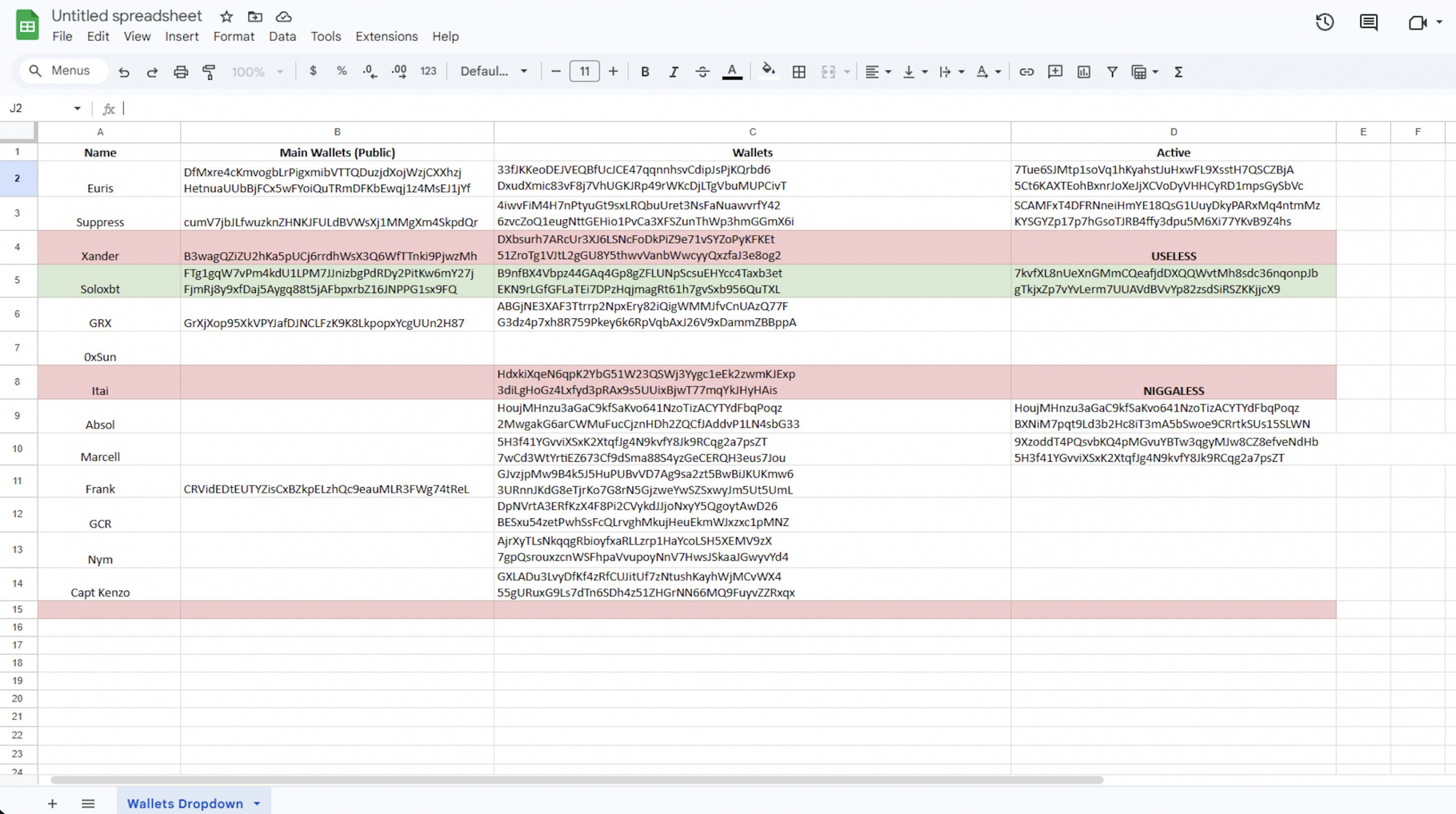 Группа создала Google Sheet, в котором собрала кошельки нескольких целевых KOL, сопоставив адреса кошельков, полученные из данных внутреннего дашборда Axiom через Брукс.