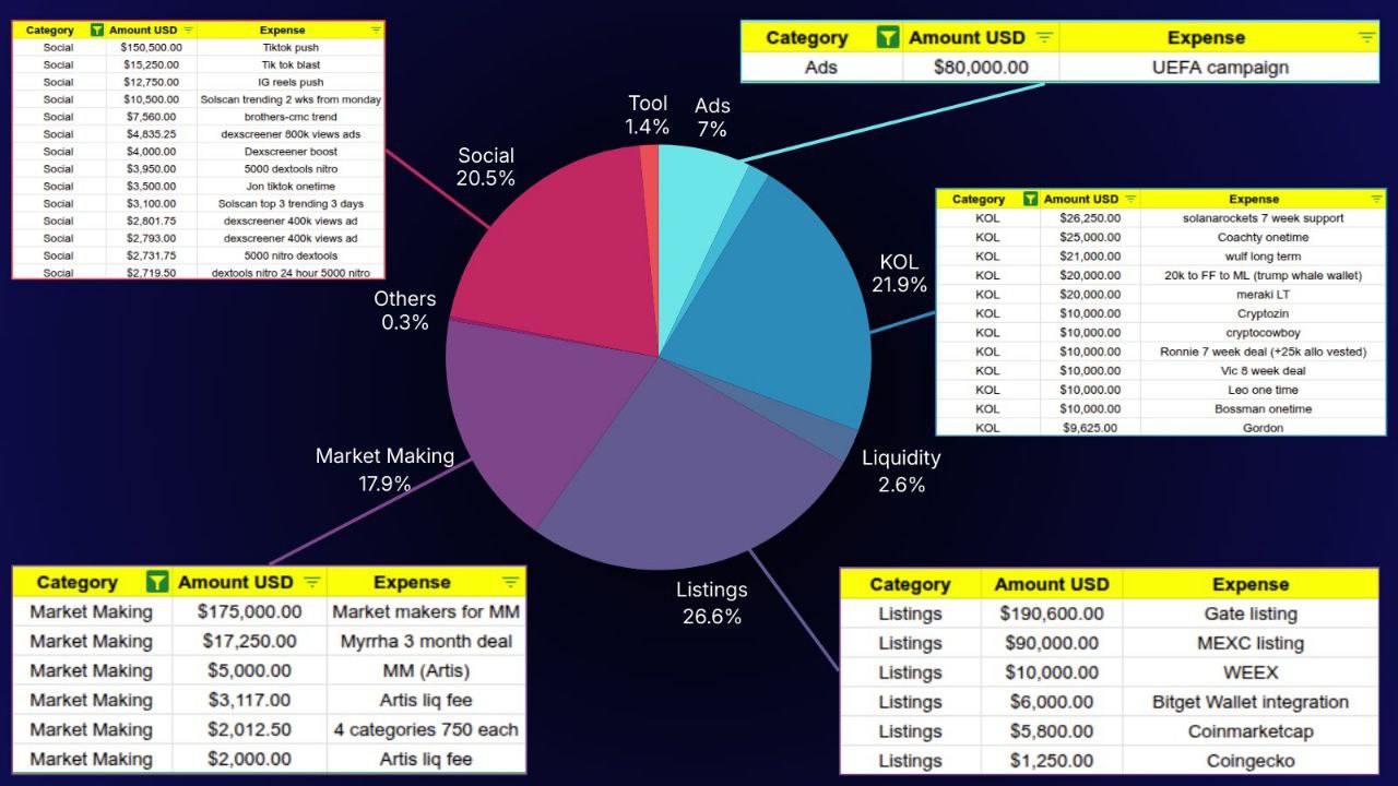 По структуре бюджета, более четверти средств ушло на листинги, около 20% — на работу с KOL, примерно столько же — на соцсети, а около 18% — на маркет-мейкинг. Остальное — это ликвидность, технические мелкие сервисы и различные дополнительные расходы. Среди них также была обозначена «UEFA campaign» на $80 тыс., которая, однако, не имеет никаких доказательств реального существования и выглядит очередной попыткой создать иллюзию крупного партнерства.