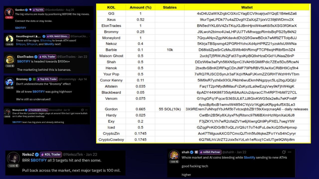 Отдельная вкладка документа описывает алокацию токенов для KOL («Key Opinion Leaders», жаргонное «callers» — то есть лидеры мнений). В списке — GG, Zeus, ElonTrades, Brommy, Moneylord, NekoZ, Barbie, Maison Ghost, Shah, Henok, Your Pop, Conor Kenny, Gordon и другие. Каждый получал долю от эмиссии в пределах 0,1-1%, отметку «Stables: Yes» (там, где выплаты делали в стейблкоинах), правила вестинга (постепенной разблокировки токенов) и продаж, а также конкретный адрес кошелька.