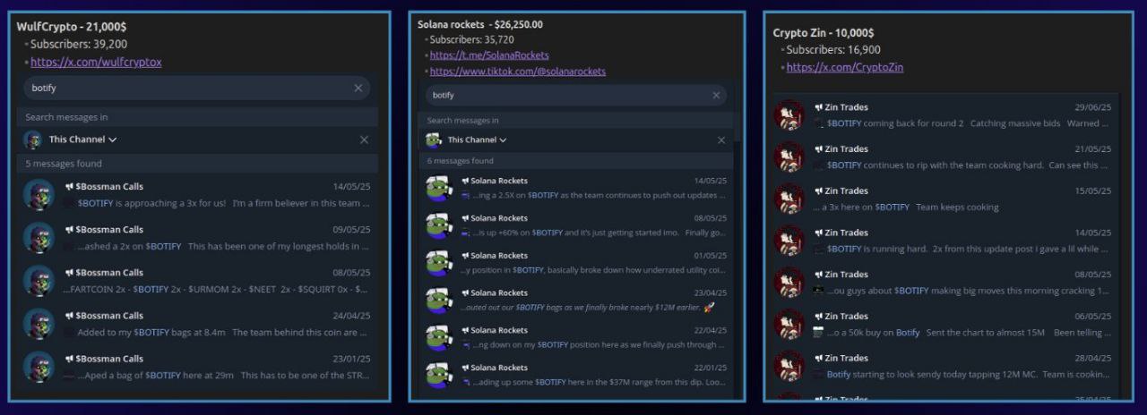 Telegram-каналы стали еще одним направлением распределения бюджета. В документе указаны WulfCrypto ($21 тыс., около 39 тыс. подписчиков), Solana Rockets ($26 250, около 35 тыс. подписчиков) и CryptoZin ($10 тыс., около 17 тыс.). В логах этих каналов появлялись сообщения вроде «добавил в сумку», «жду x3», «самая недооцененная монета», направленные на создание искусственного FOMO среди розничных инвесторов. На практике даже каналы с 15-20 тыс. аудитории получали пятизначные суммы просто за то, чтобы поддерживать нарратив имитации спроса.