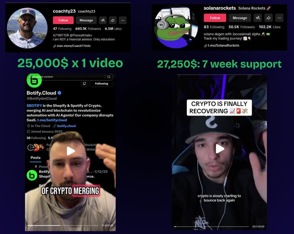 Расходы на TikTok также были значительными и работали по тому же принципу. За один видеоролик блогеру Coachtzy23 заплатили $25 тыс. Кампания с SolanaRockets длилась семь недель и стоила $27 250. Контент был максимально простым: утверждения о «восстановлении крипторынка», сравнение Botify с Shopify или Spotify, заявления об «AI + блокчейн», стандартные обещания роста. Для новичков это выглядело как легитимная реклама перспективного продукта, хотя в реальности продукта не существовало — был лишь одноразовый памп-токен.
