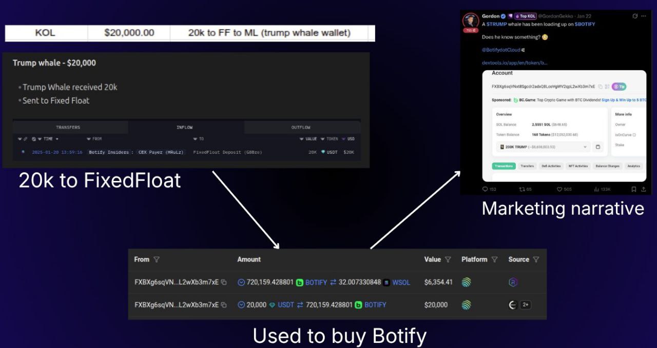 Самый яркий эпизод связан с так называемым «Trump Whale». Команда Botify перевела $20 тыс. на кошелек, который содержал большую позицию в TRUMP. После прокрутки через FixedFloat этот кошелек начал покупать токены Botify. В соцсетях это подали как «кита из TRUMP, который заходит в Botify», формируя образ авторитетного инвестора. На самом деле покупка осуществлялась просто на деньги проекта.