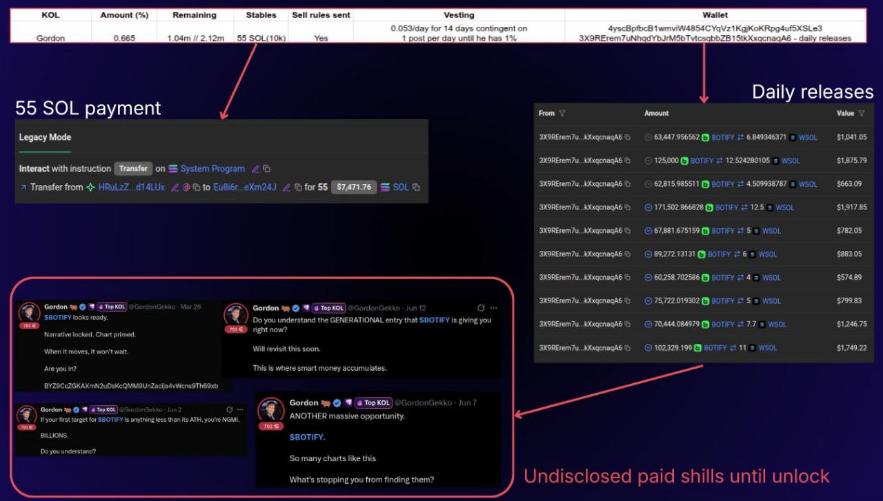 Пример инфлюенсера Gordon показывает типичную схему. Он получил фиксированную сумму, примерно 0,6-0,665% предложения (частично с мгновенным доступом, частично с ежедневной разблокировкой), дополнительный платеж 55 SOL (примерно $7 500) и условие делать посты о Botify ежедневно до того момента, пока его доля не уменьшится до 1%.