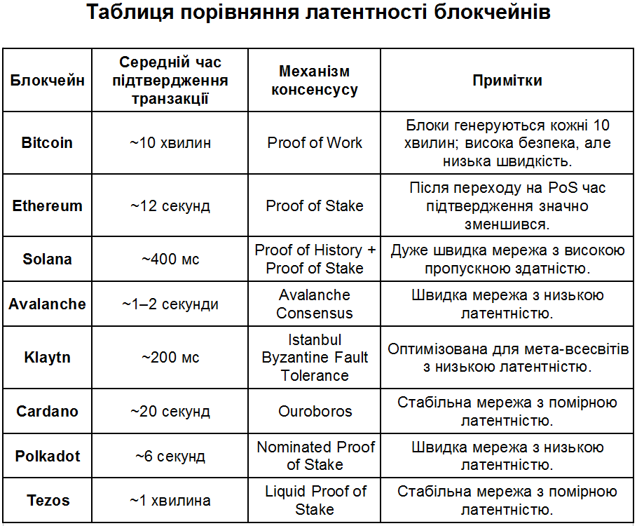 Bitcoin имеет значительную латентность из-за своей архитектуры: подтверждение транзакций занимает около 10 минут — это гораздо больше по сравнению с другими сетями. Зато Solana демонстрирует чрезвычайно низкую латентность и обрабатывает транзакции за считанные секунды — это крайне важно для финансовых приложений или игр.