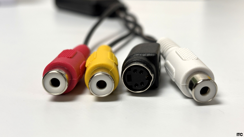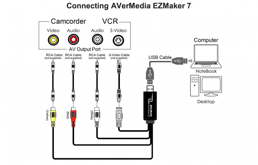 Подключение AVerMedia DVD EZMaker 7 максимально простое: RCA-кабели (желтый — видео, красный и белый — аудио) к граберу, а далее USB в ноутбук. Но вам стоит иметь под руками комплект «тюльпанов».