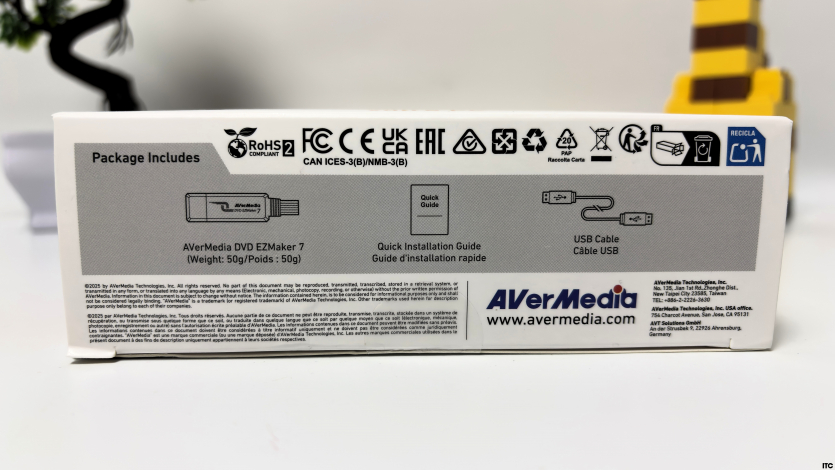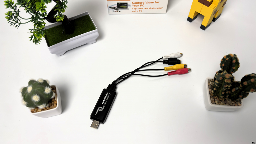 AVerMedia DVD EZMaker 7 максимально компактное устройство, которое больше напоминает USB-адаптер, чем полноценную карту захвата. Габариты 82 × 28,5 × 14 мм и вес около 50 граммов делают его почти незаметным на столе. Он не занимает места, не требует отдельного питания и не выглядит как что-то сложное или «профессиональное».