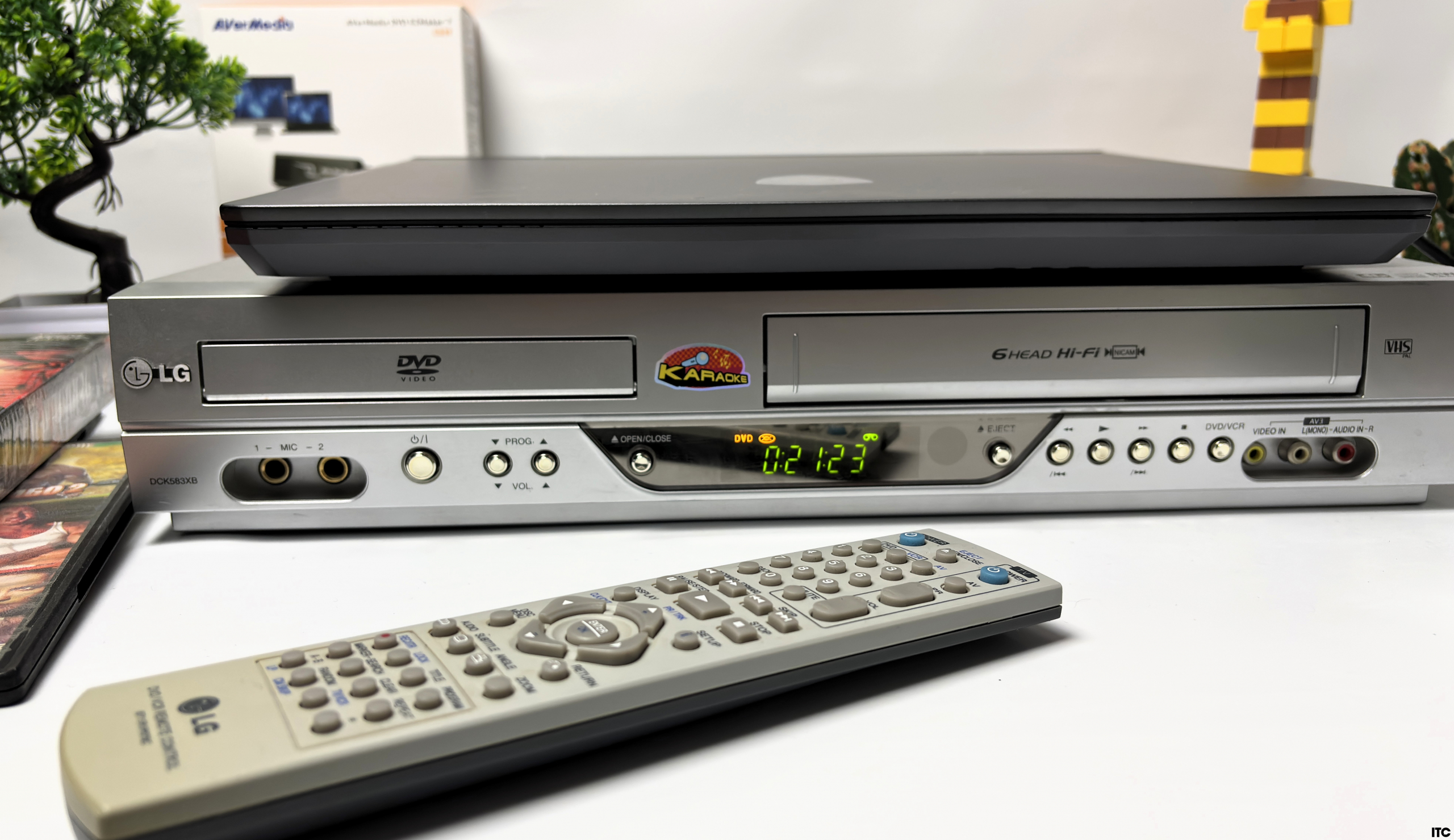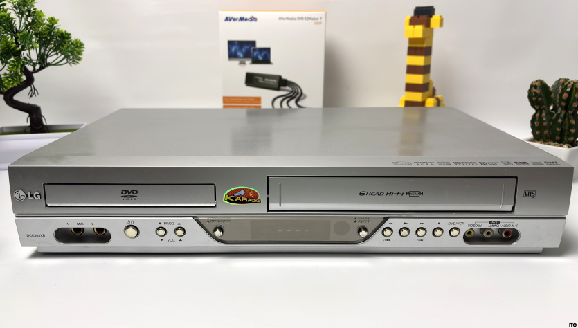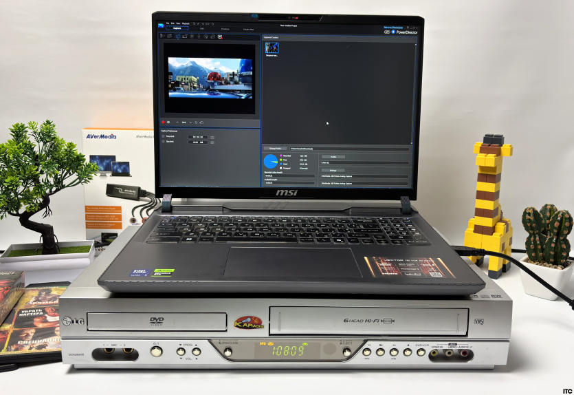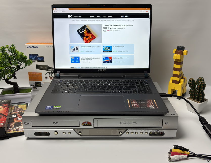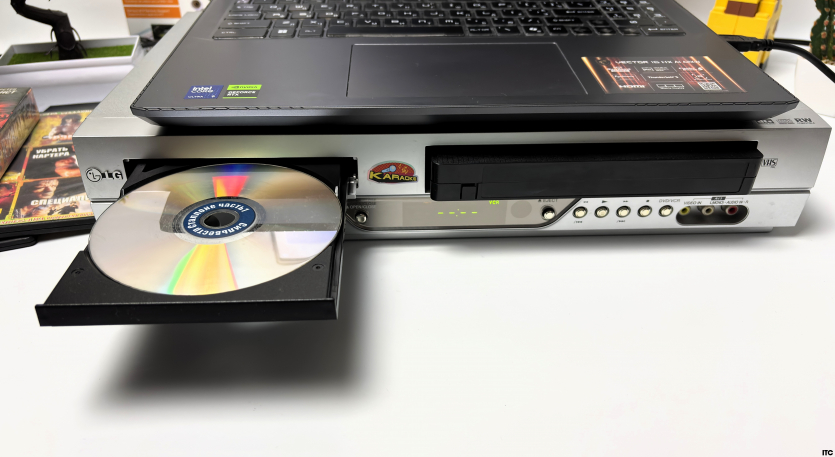 Чтобы не выдумывать лабораторные сценарии в вакууме, мы пошли максимально жизненным путем. В роли источника сигнала у нас старенький, но еще боевой видеомагнитофон LG DCK583XB, который умеет крутить VHS-кассеты и DVD-диски. В роли приемника выступил современный ноутбук MSI Vector 16 AI с Windows 11. Аналог встречается с ИИ-эпохой.