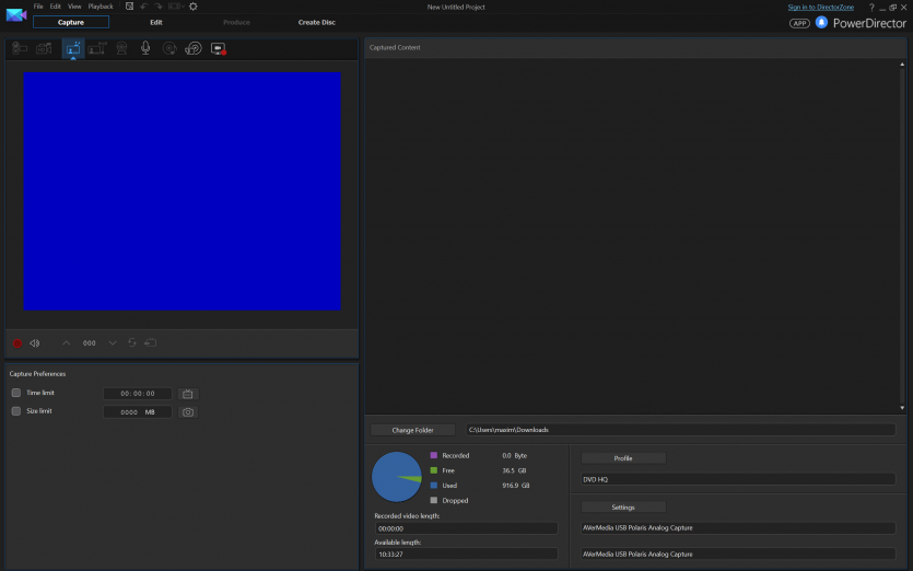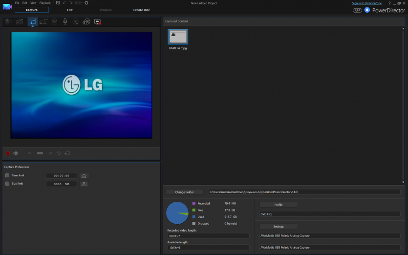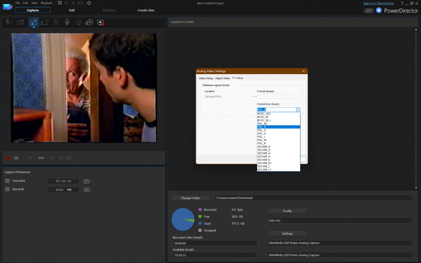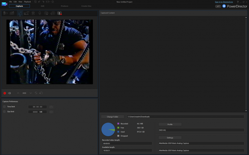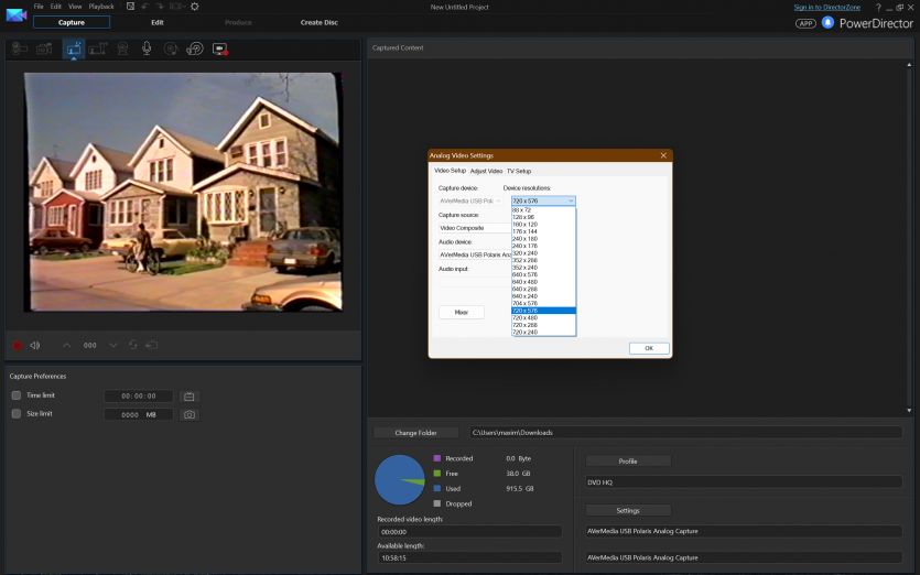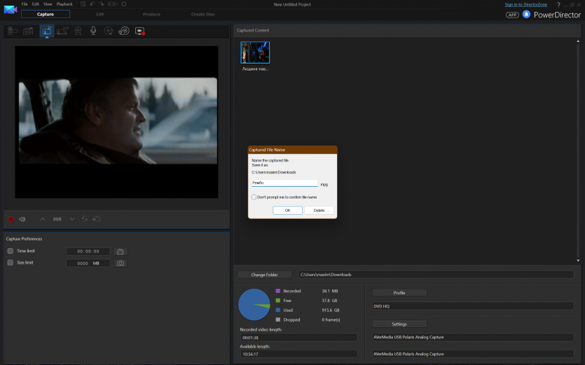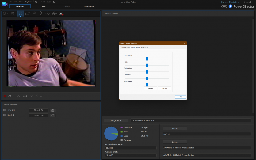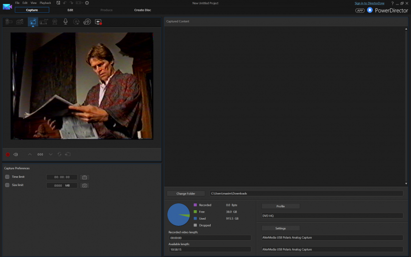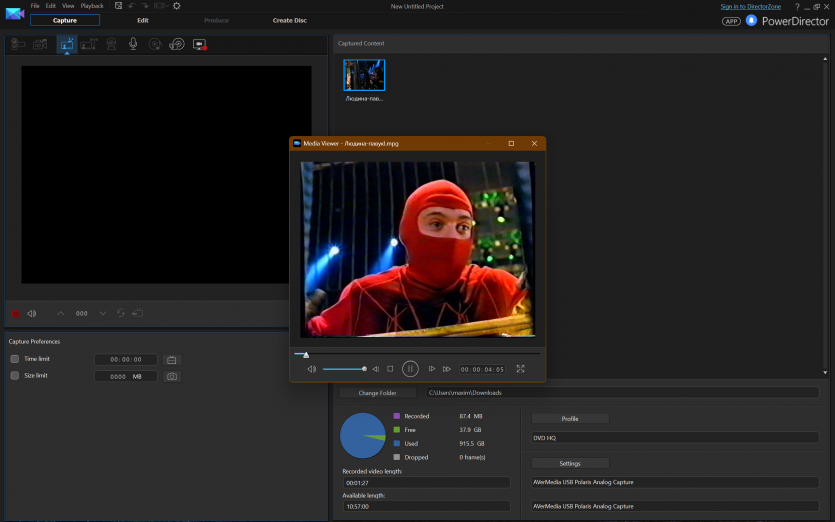 В качестве ПО использовали CyberLink PowerDirector 14. Версия не самая свежая, зато проверенная годами и без сюрпризов в работе с устройствами захвата. Запись велась в стандартном для PAL разрешении 720×576 пикселей.