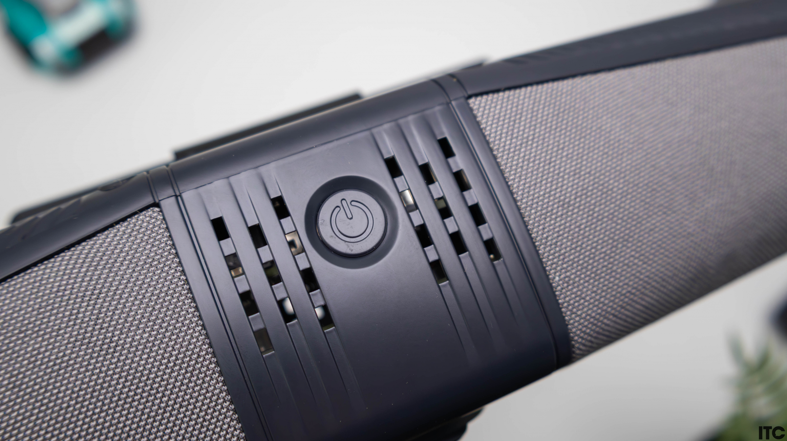 На верхней панели находятся вентиляционные отверстия для отвода тепла. Устройство слегка нагревается во время работы, особенно при длительных видеоконференциях в 4K, но это нормально и не влияет на его функционирование. Также видим физическую кнопку выключения/включения.