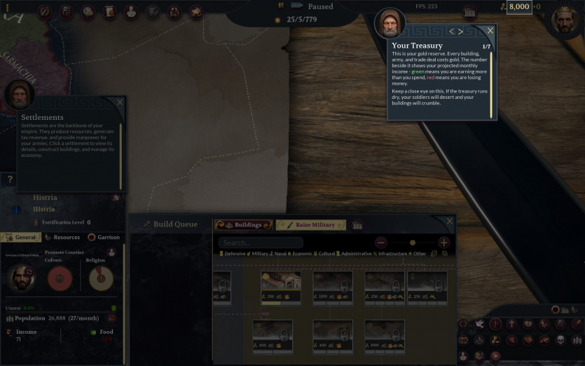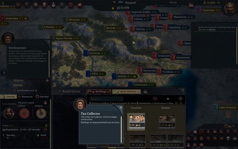 Еще одной сильной стороной Fall of an Empire являются поселения. Они как живые ячейки империи имеют смешанное культурное и религиозное население, а это напрямую влияет на налоги, производство и уровень беспорядков. Чужая культура или вера уменьшает эффективность экономики и повышает риск бунта. Развитие городов идет через ветви зданий, где многие выборы являются взаимоисключающими, поэтому вы не можете одновременно сделать из храма монастырь и базилику, а превращение города в крепость фактически жертвует гражданской инфраструктурой ради военной. Это добавляет долгосрочных последствий решениям, а империя постепенно приобретает форму, которую вы сами ей задаете.