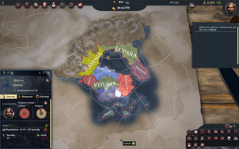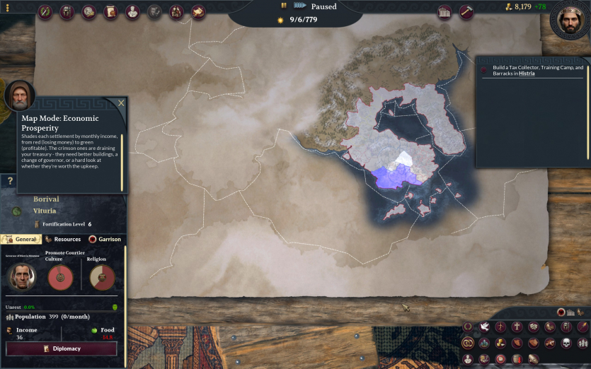 Визуально Fall of an Empire выглядит прилично. Карта здесь живая, поселения растут или приходят в упадок, укрепления и линии снабжения читаются. Архитектура, одежда и названия выдержаны в позднеримской стилистике с греческими оттенками. Атмосфера упадка передана в целом хорошо.