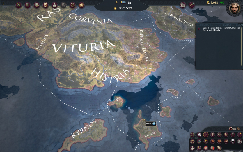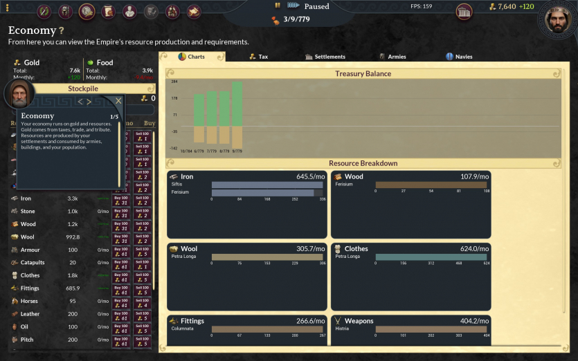 Экономическая система Fall of an Empire также имеет глубину, которая выходит за пределы стандартного «доход на ход». Ресурсы физически существуют на карте и транспортируются караванами. Если конвой с продовольствием перехватывают варвары или повстанцы, армия на фронте буквально может остаться без продовольствия. Армии имеют собственные запасы, потребляют их в походе и во время боев, а при их отсутствии начинается истощение и дезертирство. Во время осады снабжение прерывается полностью, и тогда решающим становится то, успел ли город накопить достаточно продовольствия. Это делает контроль дорог, перевалов и портов стратегически значимым, поэтому география перестает быть декорацией.