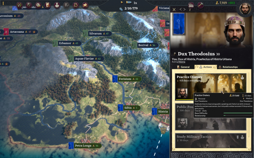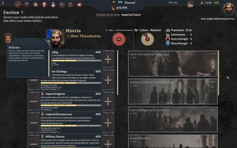 Интересно реализована и система блоков власти. Сенаторская аристократия, легионы, бюрократия, религиозные группировки, федераты-варвары — каждый из этих центров силы имеет собственные ожидания от императора. Повышаете налоги значит страдает лояльность губернаторов. Делаете ставку на мобильные полевые армии вместо укрепленной границы и сразу приграничные регионы начинают нервничать. Вводите религиозную нетерпимость и сразу уменьшаете влияние ересей, но одновременно получаете волну беспорядков в смешанных провинциях. Политика меняется не мгновенно, потому что вы издаете эдикты, и каждое изменение вызывает краткосрочную дестабилизацию. В разгар войны это может обернуться катастрофой.