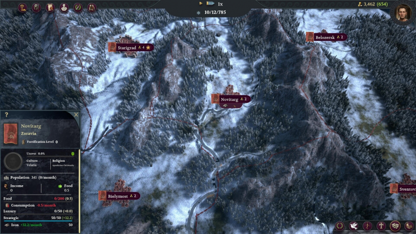 Мир игры большой, поэтому у нас есть сотни поселений, провинции, линии снабжения и караваны. Вы строите укрепления, управляете ресурсами, следите за конвоями, которые физически перемещаются по карте. Одной из задач является удержание торговых маршрутов от разгрома. Смена сезонов добавляет напряжения, поэтому зима приносит голод и логистические трудности, а весна — передышку и урожай.