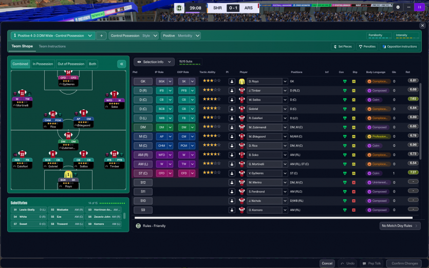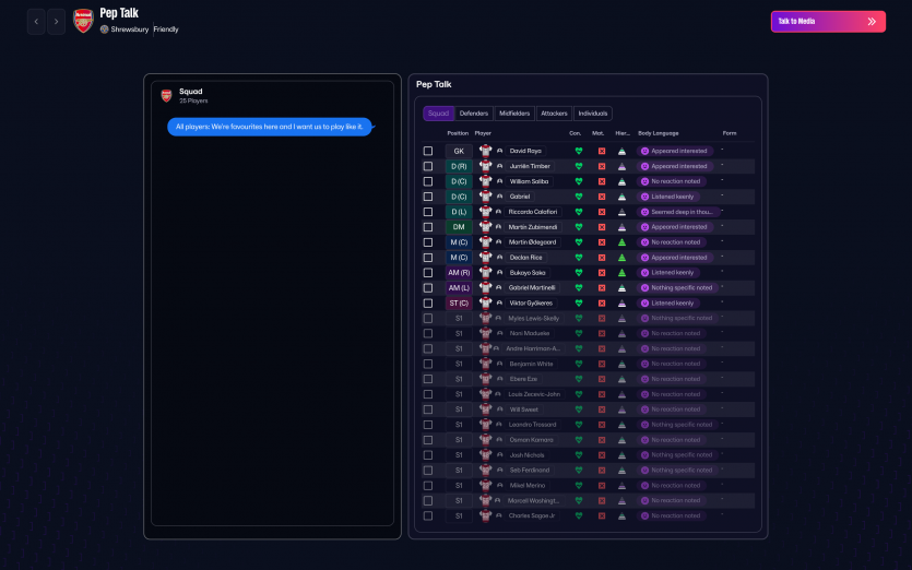 Мораль игроков, старая больная тема серии, тоже пережила редизайн. Вместо набора неочевидных эмоциональных состояний теперь есть три составляющие удовольствия (роль, время на поле, перспектива развития). Это делает внутреннюю атмосферу более понятной: меньше сюрпризов вроде игрок обиделся из-за неизвестно чего.