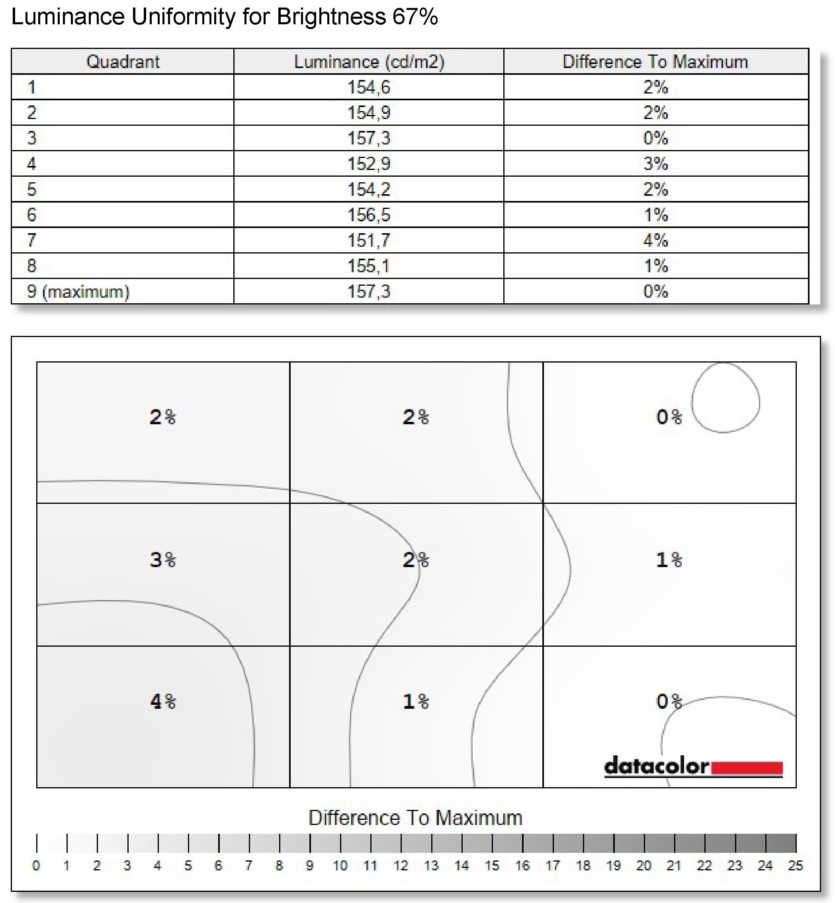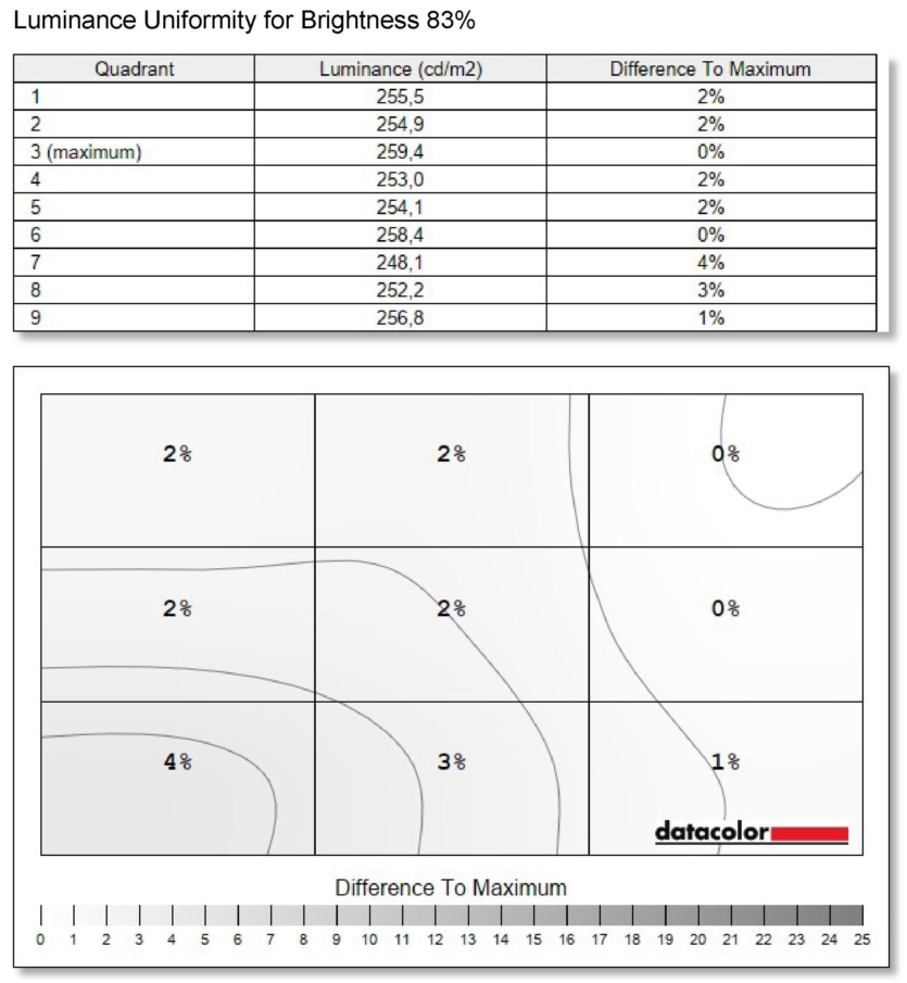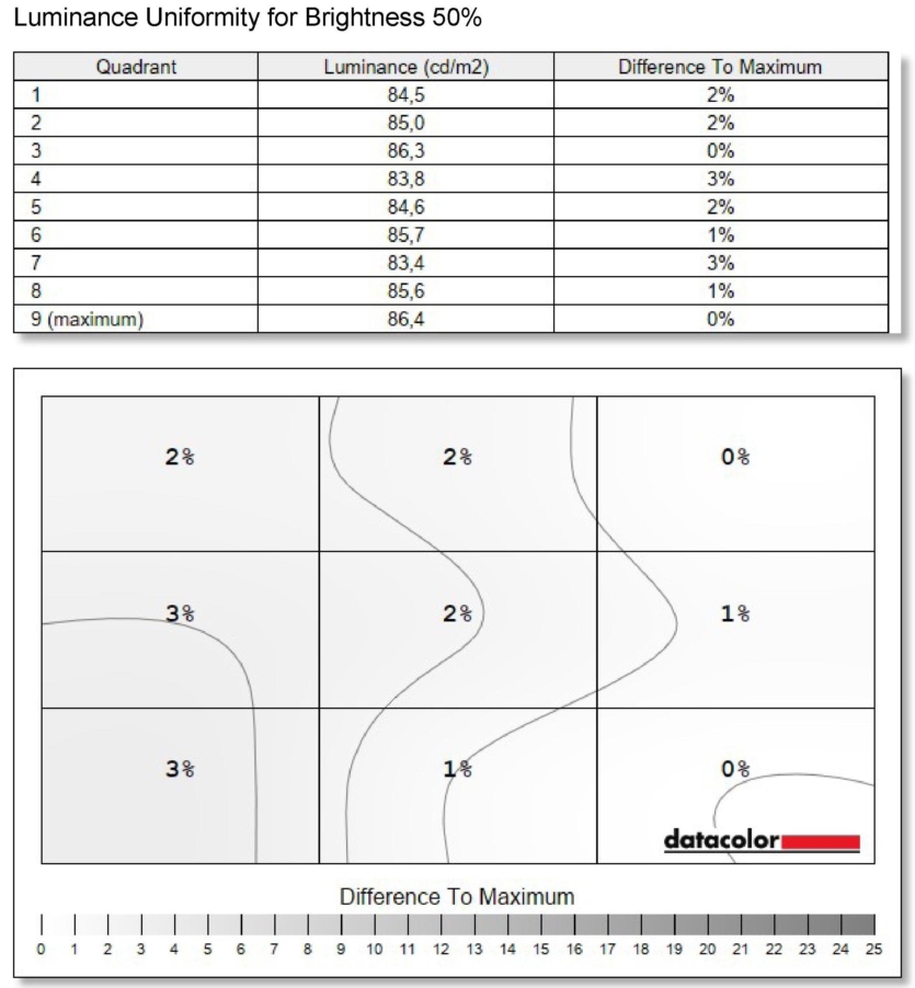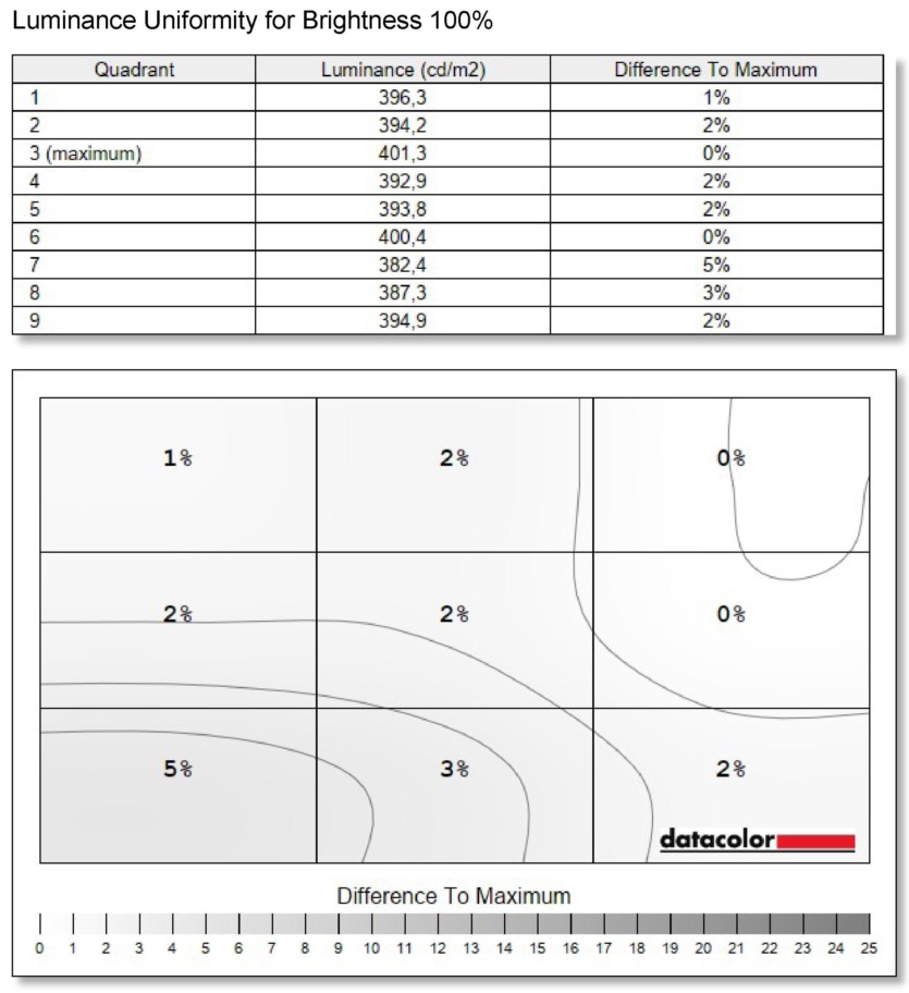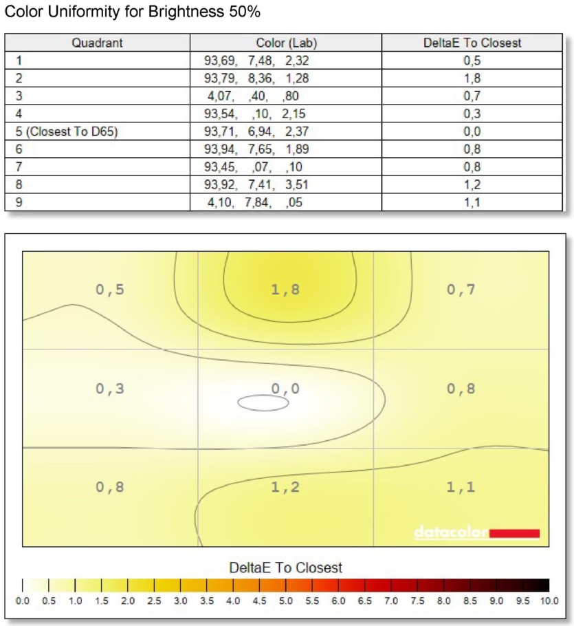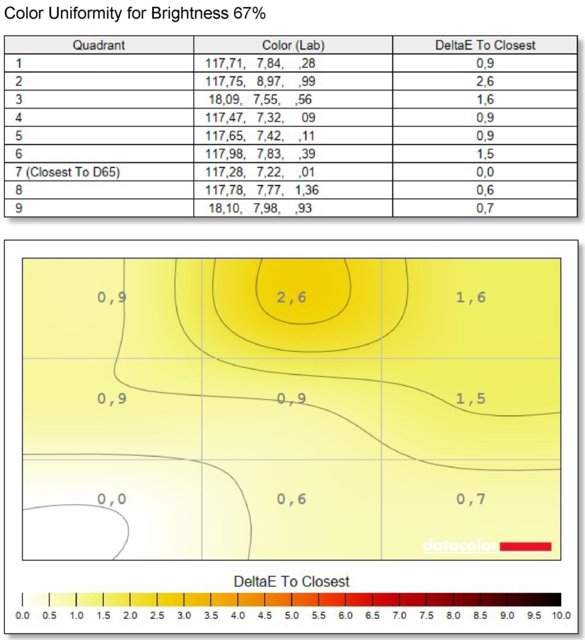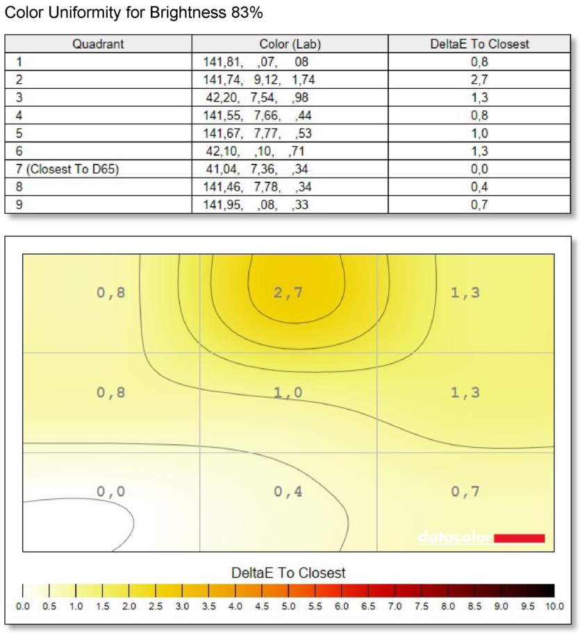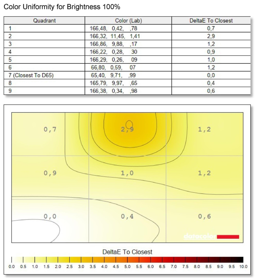 Замеры показали, что максимальная яркость дисплея составляет около 415 кд/м². Равномерность цветовой температуры на хорошем уровне. Максимальное отклонение можно встретить в центральной верхней части экрана (MAX Delta E=2.9).