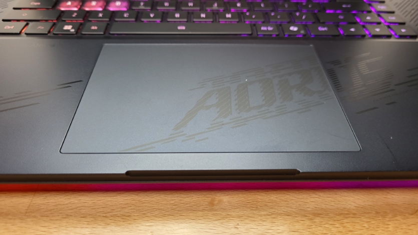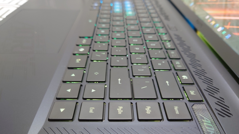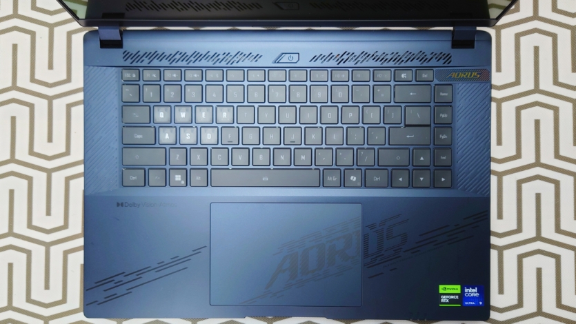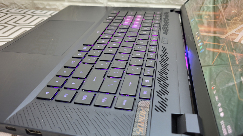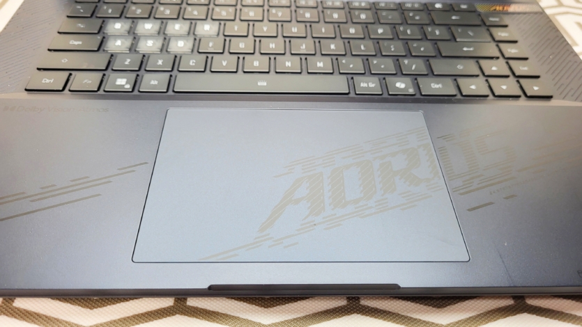 Gigabyte AORUS MASTER 16 оснащена клавиатурой островного типа с трехзонной RGB-подсветкой, которая в целом оставляет положительные впечатления. Она довольно тихая, а ход клавиш составляет 1.7 миллиметра.