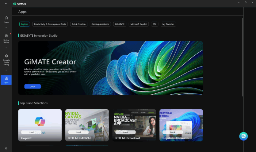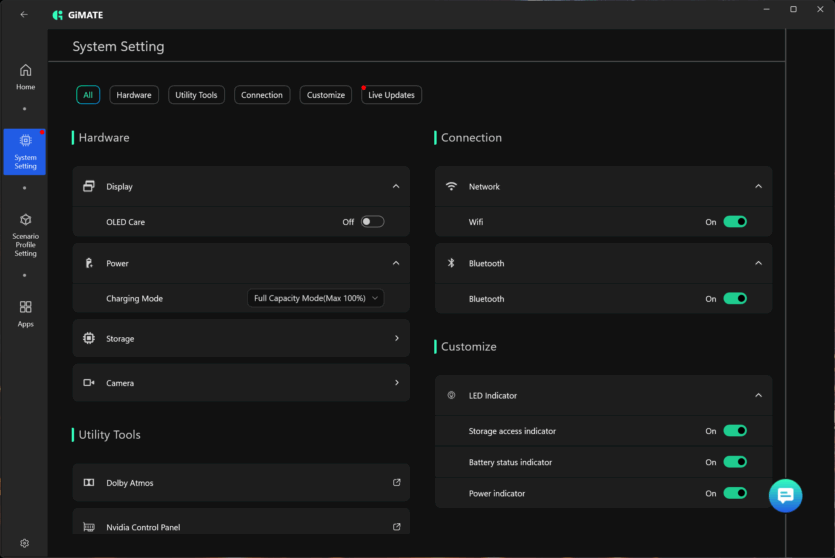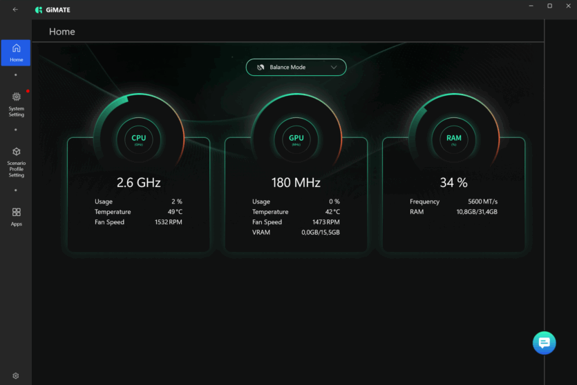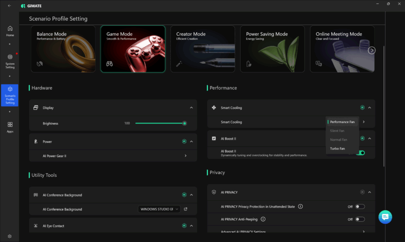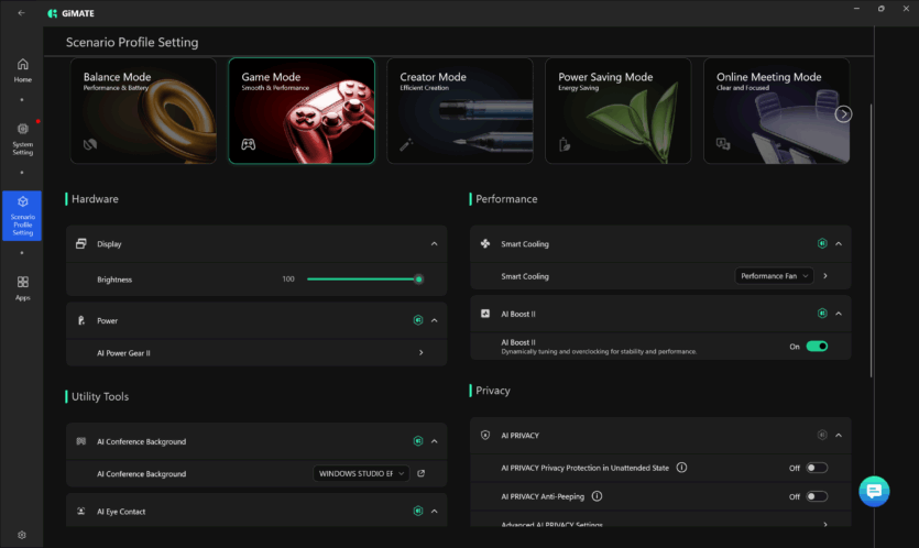Вместо привычного GIGABYTE CONTROL CENTER будущим владельцам доступно новое приложение под названием GiMATE. Оно объединяет в себе все необходимые настройки, начиная от выбора профиля производительности и заканчивая ИИ функциями.