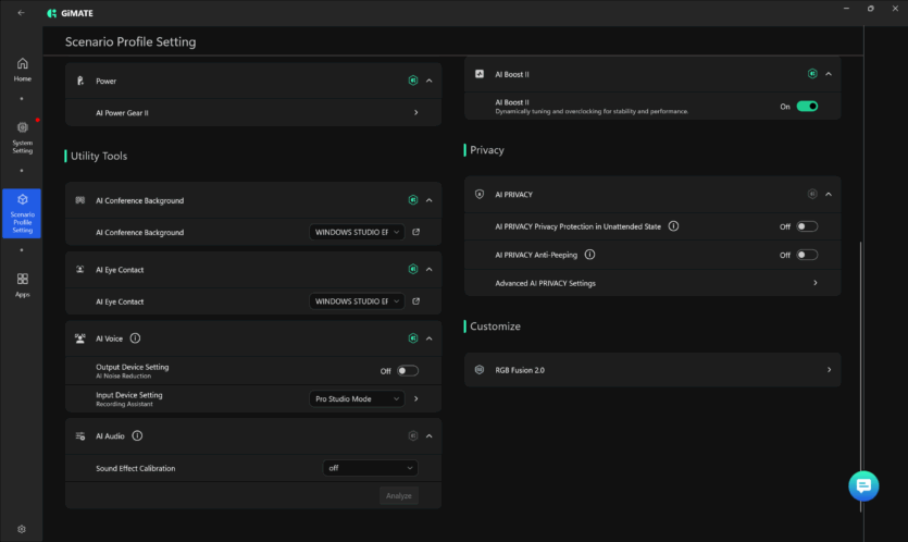 Scenario Profile Setting объединяет под «одной крышей» много интересных фишек. Здесь можно выбрать себе задний фон, который будет генерироваться для митов, отслеживание глаз, выбирать пресет записи для микрофона, настраивать RGB подсветку, управлять интеллектуальной системой распределения быстродействия — AI Boost II и т.д.