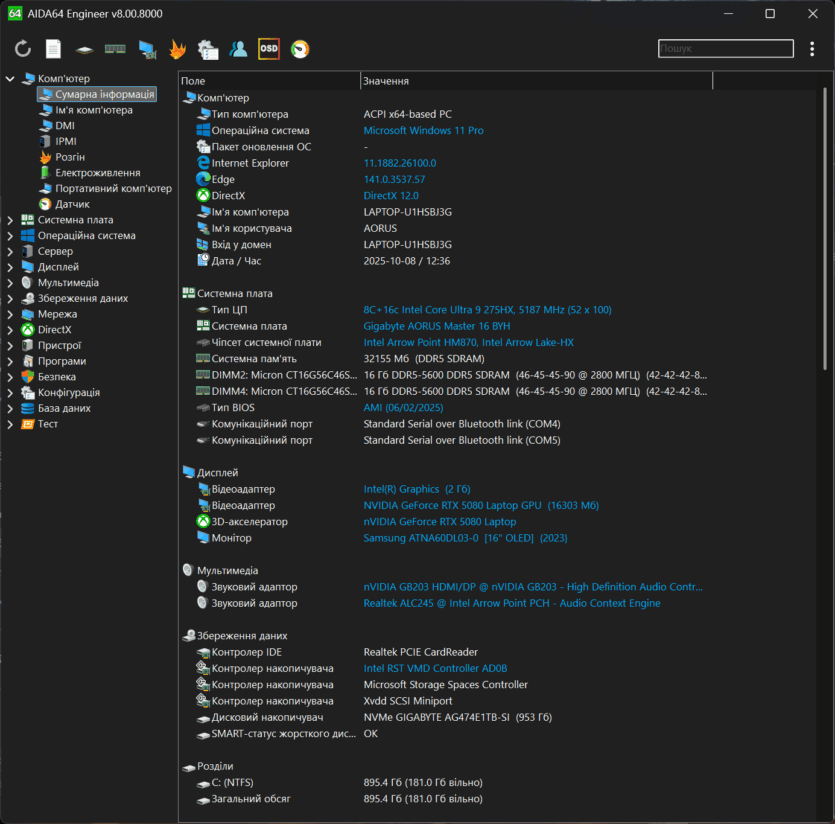 Из беспроводных интерфейсов есть Wi-Fi 7 (802.11be 2×2), поддерживающий скорость до 8 774 Mbps и Bluetooth 5.4. Сигнал ловится стабильно и очень чувствительно. Там где мой рабочий ноутбук отображал лишь одно деление в силе сигнала, Gigabyte AORUS MASTER 16 обеспечивал целых три. Немножко странно видеть 1G Ethernet в лэптопе такого уровня.