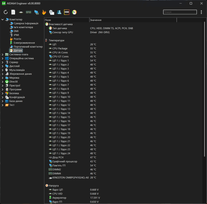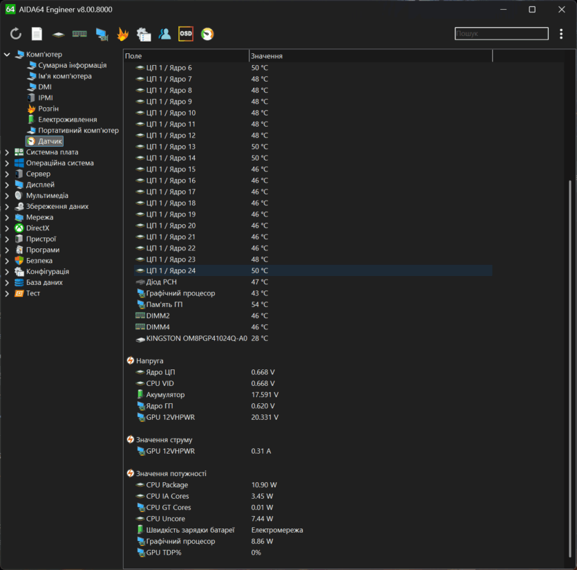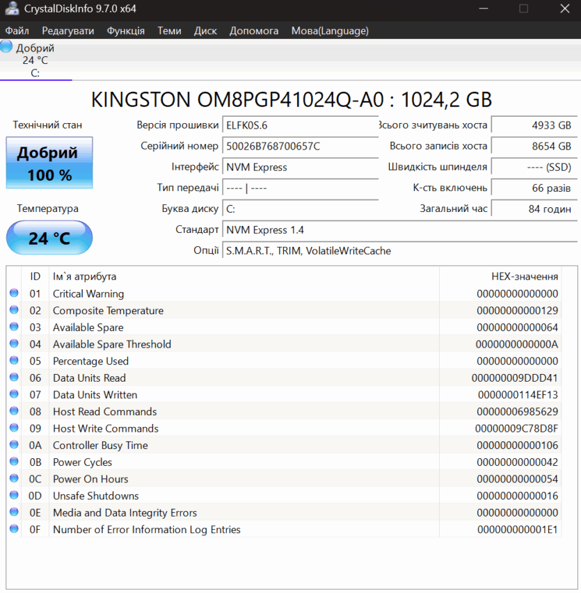 Внутренний M.2 2280 SSD накопитель Kingston OM8PGP41024Q-A0 емкостью 1 ТБ работает со средней скоростью в режиме PCIe Gen4. Конечно, в ноутбуке такого класса хотелось видеть более скоростной накопитель.