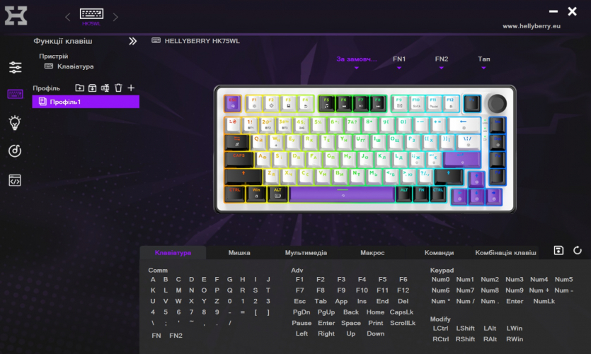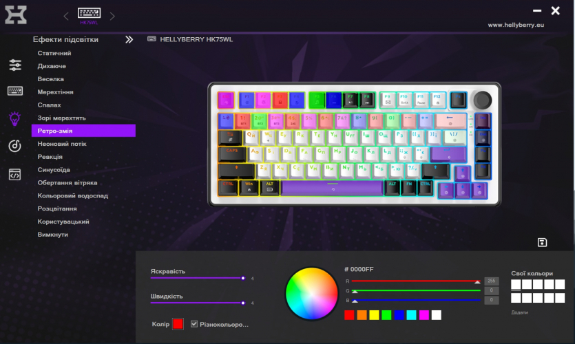 Программа имеет украинскую локализацию. Через нее настраиваются макросы, переназначение клавиш, различные RGB-эффекты и тому подобное. Все профили хранятся во встроенной памяти клавиатуры, поэтому на чужом компьютере ваши настройки будут при вас.