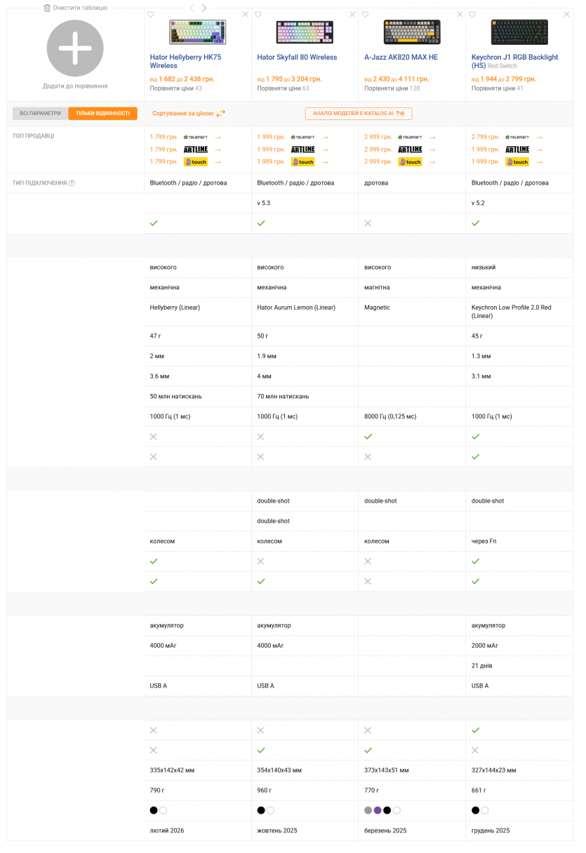Также есть Keychron J1 с ценником от 1944 гривен. Это популярная модель, но она как будто немного хуже по уровню шумоизоляции, и аккумулятор здесь только 2 000 мАч, однако бренд проверенный и надежный. Среди собственных продуктов HATOR можно посоветовать Skyfall 80 (цена от 1999 грн) с переключателями Aurum. Наш обзор этой модели здесь.