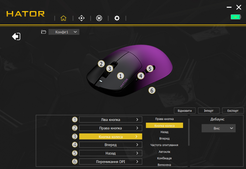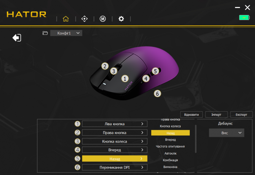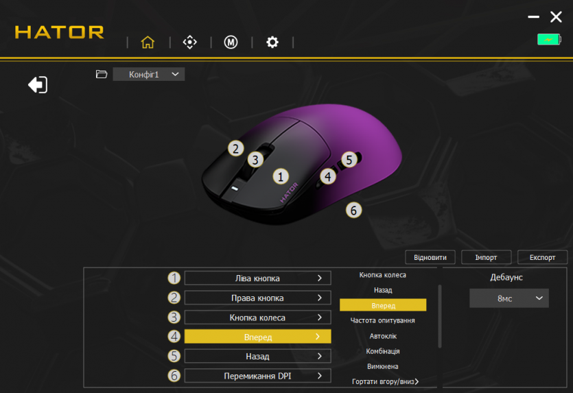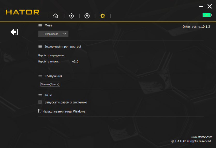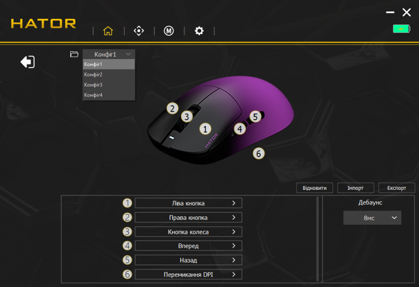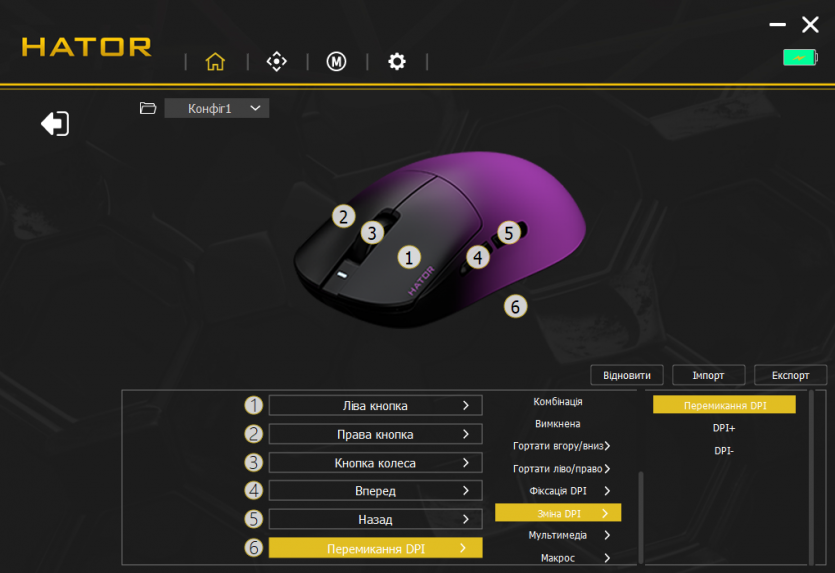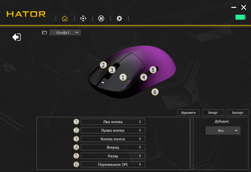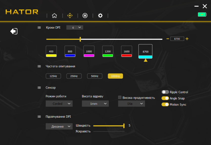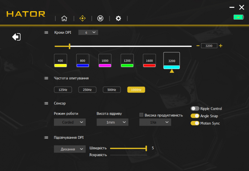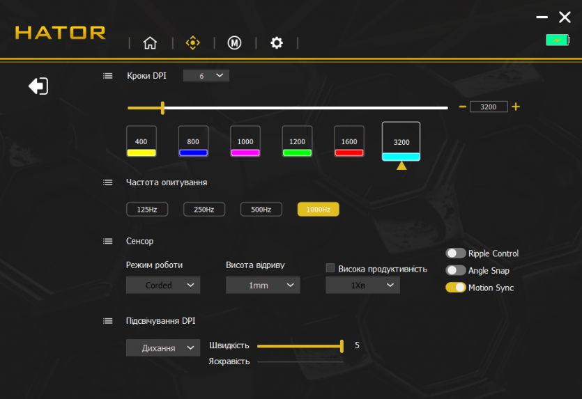 Центральным элементом в настройках является HATOR MouseHUB — фирменное ПО, которое объединяет все возможности устройства в одном интерфейсе. В нем есть отдельные вкладки для настройки DPI, частоты опроса, макросов, подсветки и сохранения профилей. Интерфейс построен максимально просто: основные параметры доступны одним-двумя кликами.