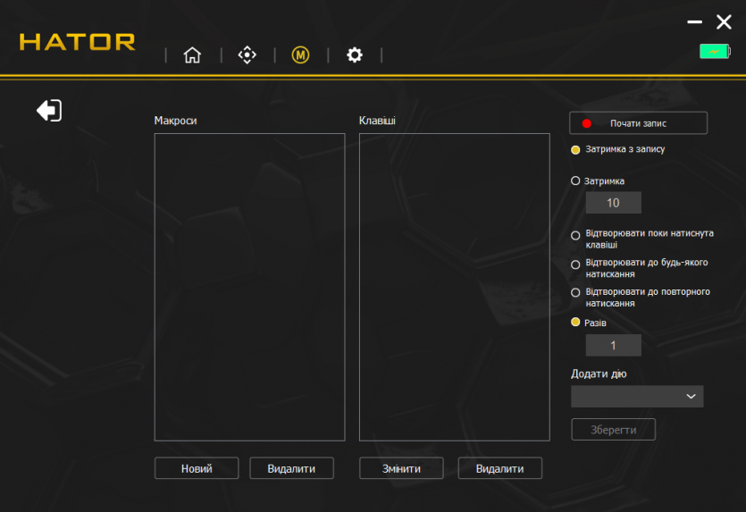 Раздел макросов дает возможность назначать комбинации кнопок, задержки и циклические действия. Макросы можно привязывать к конкретным профилям, что дает гибкость при игре в различные жанры.