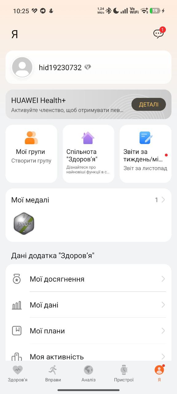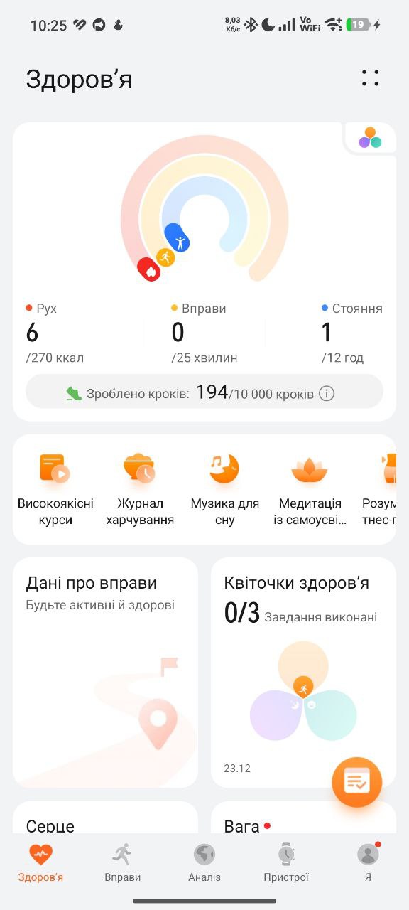 Приложение Huawei Health имеет информативный интерфейс с несколькими вкладками типа активности (шаги, калории, дистанция), здоровье (пульс, сон, стресс, SpO2), тренировки (история всех занятий), а также раздел «Устройства» (настройки часов) и личная информация.