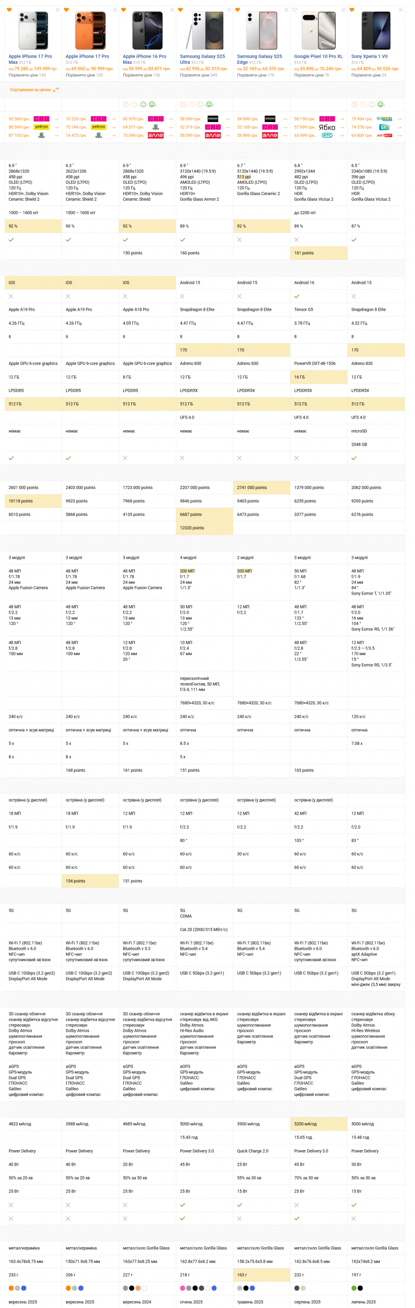 На Android-рынке флагманы выглядят привлекательно и за меньшие деньги Samsung Galaxy S25 Ultra 512 ГБ можно найти за 42 996-74 799 гривен, а Galaxy S25 Edge — от 33 529 до 58 999 гривен Sony Xperia 1 VII 512 ГБ остается нишевым продуктом с крутым 4K-дисплеем и профессиональной видеосъемкой, но высокая цена и ограниченная доступность делают его малопрактичным для большинства.