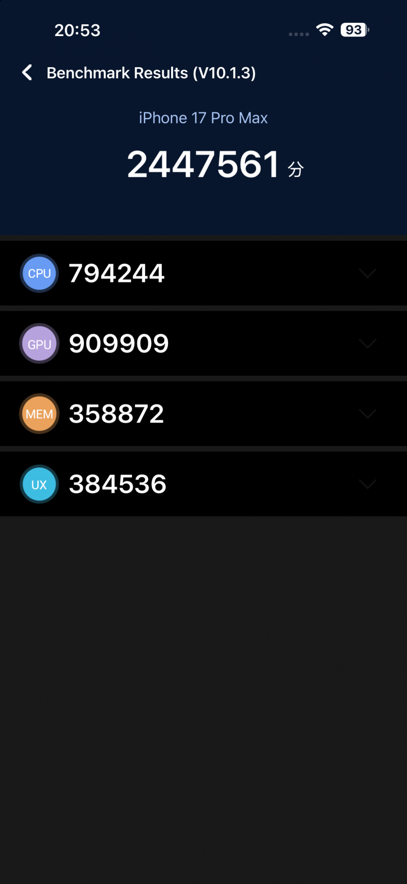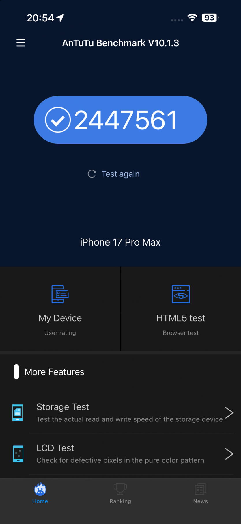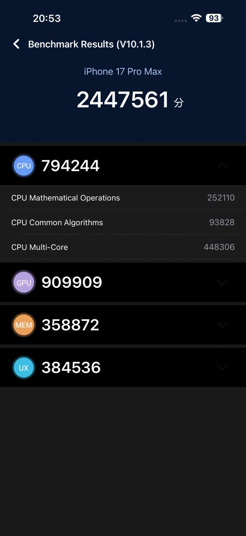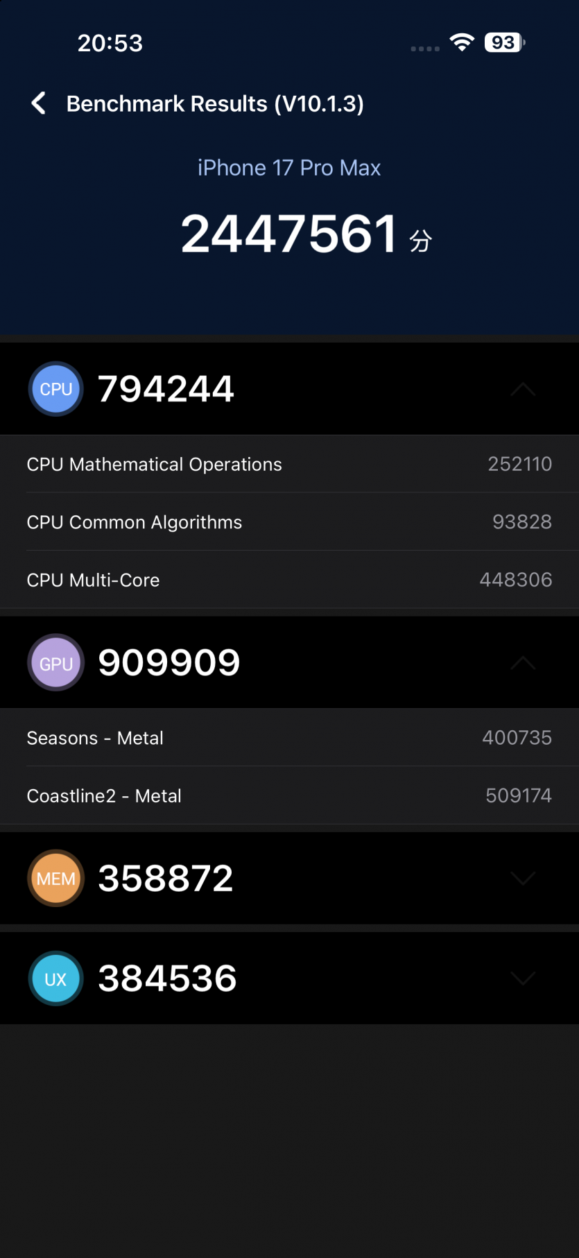 В Geekbench новый чип выдает около 3700 баллов в одноядерном тесте и более 9300 в многоядерном. В AnTuTu — более 2,44 млн «попугаев», то есть уровень iPad Air 2025 на базе M3. И это не просто сухие цифры, то есть все, что делает смартфон действительно мгновенное. Переключаешься между десятком приложений и не имеешь ни намека на фриз. iPhone 17 Pro Max ведет себя так, будто имеет бесконечный запас ресурсов.