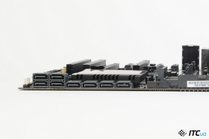 Для конфигурации дисковой подсистемы имеется восемь портов SATA 6 Гб/с. Отметим оригинальную компоновку разъемов.