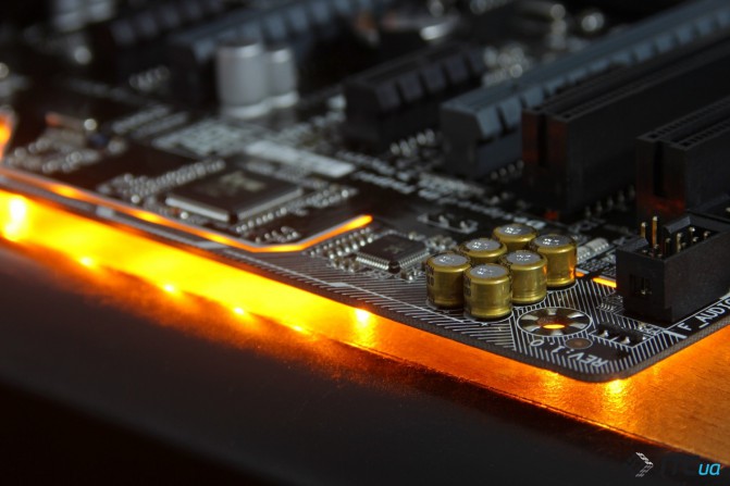 Звуковая подсистема основана на 8-канальном кодеке Realtek ALC887. Область аудиотракта частично отделена от основного блока и подсвечена с обратной стороны PCB оранжевыми светодиодами. Кроме изолирования и дополнительной иллюминации, для аудиоподсистемы задействованы специализированные емкости Nippon. Приемы, который еще недавно производители использовали лишь для старших моделей плат, теперь применяются и для устройств среднего уровня. Итоговое качество звука на довольно неплохом уровне.