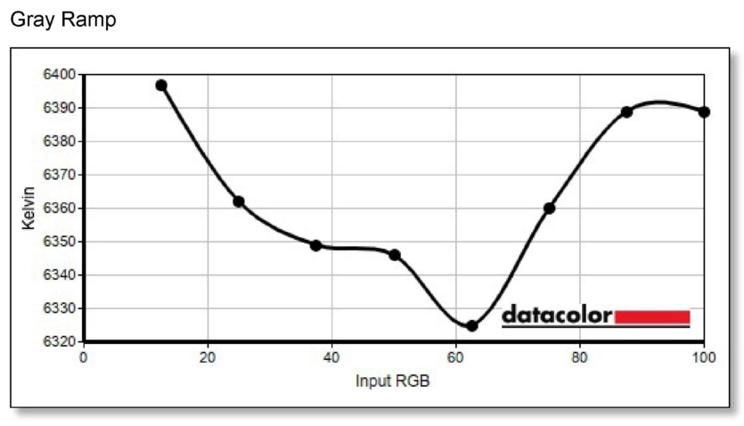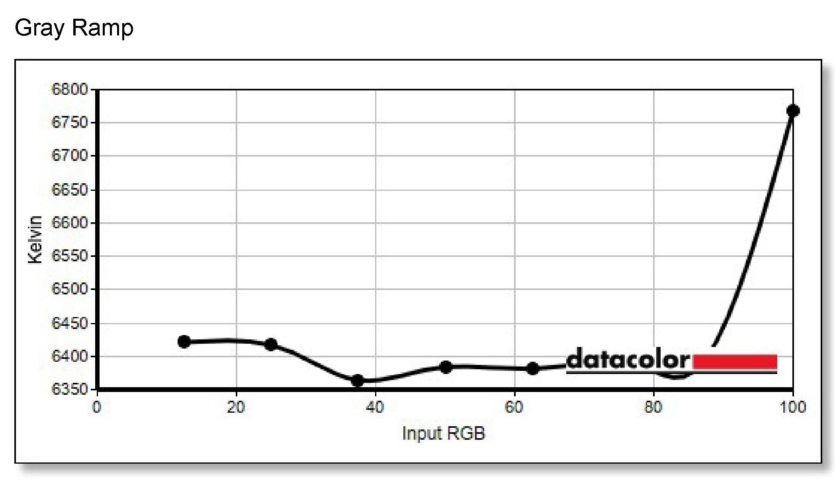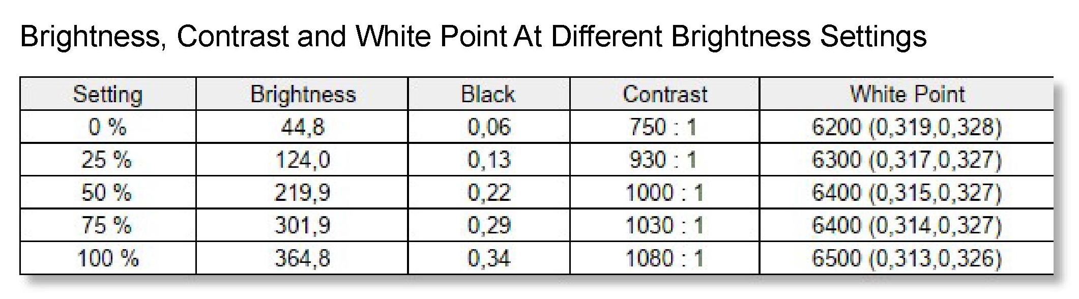 Несмотря на заявленную максимальную яркость на уровне 250 кд/м², удалось намерить гораздо более— целых 364 кд/м². При 100% яркости мы приобретаем замечательную комбинацию результатов контрастности (1080:1) и цветовой температуры — 6500К. Приятно, когда заявленные показатели не просто совпадают, а еще и превосходят ожидания.