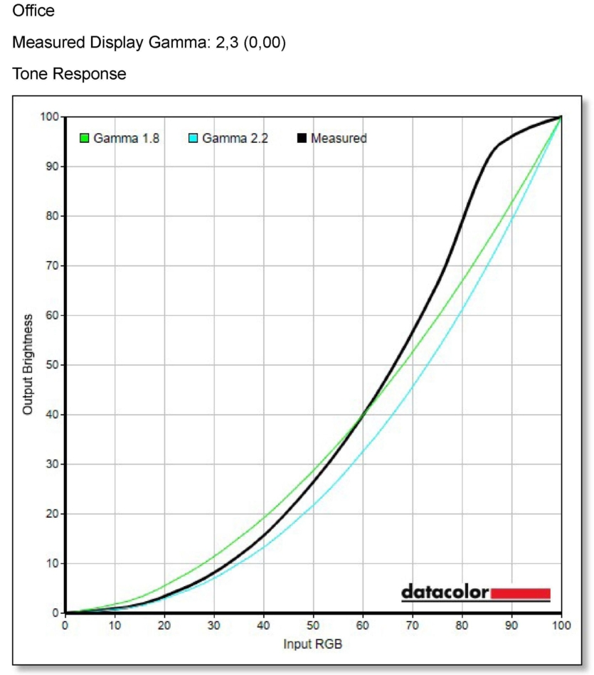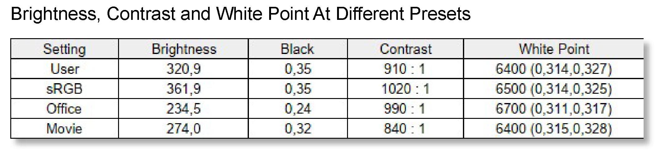 В офисном режиме дефолтная яркость самая маленькая — 234 кд/м², а рекордсменом по этому параметру стал пресет sRGB.