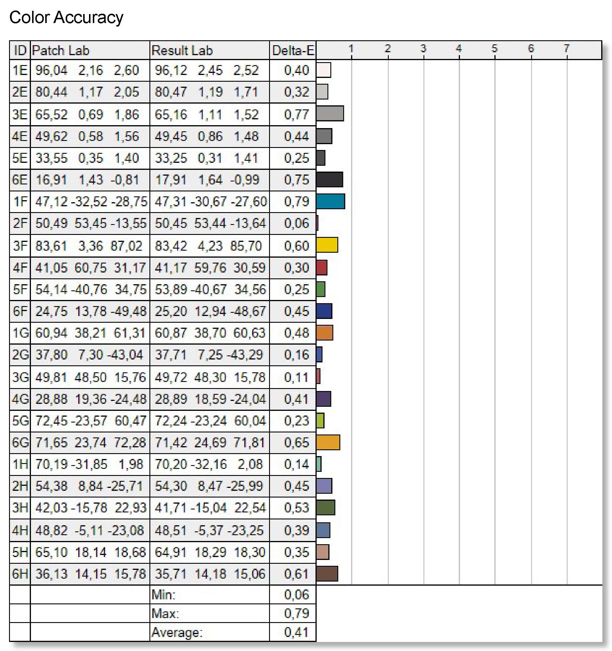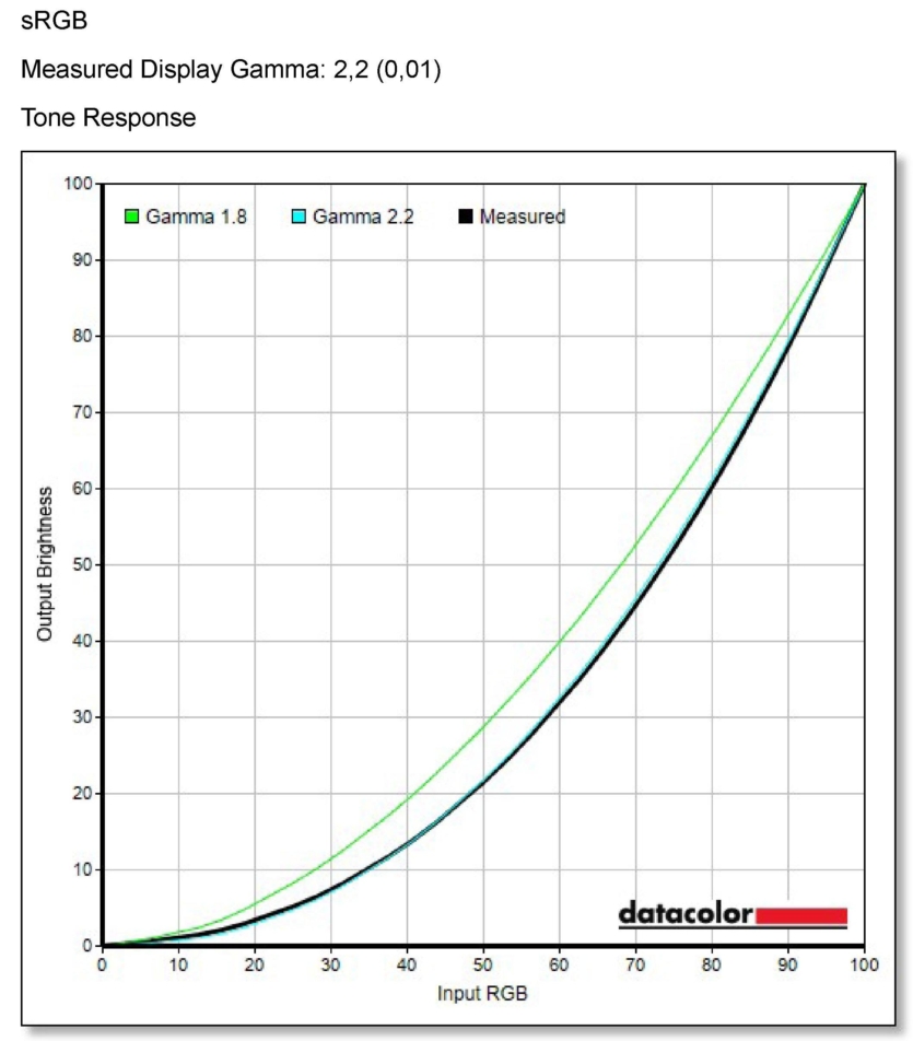 Заметно, что монитор проходил заводскую калибровку. Среднее значение ΔE впечатляет — 0.41. Причем все цвета очень близки к эталонным значениям. Это один из лучших показателей за последнее время среди многих мониторов, которые попадали на наши редакционные обзоры.