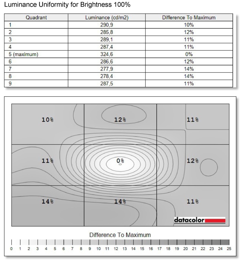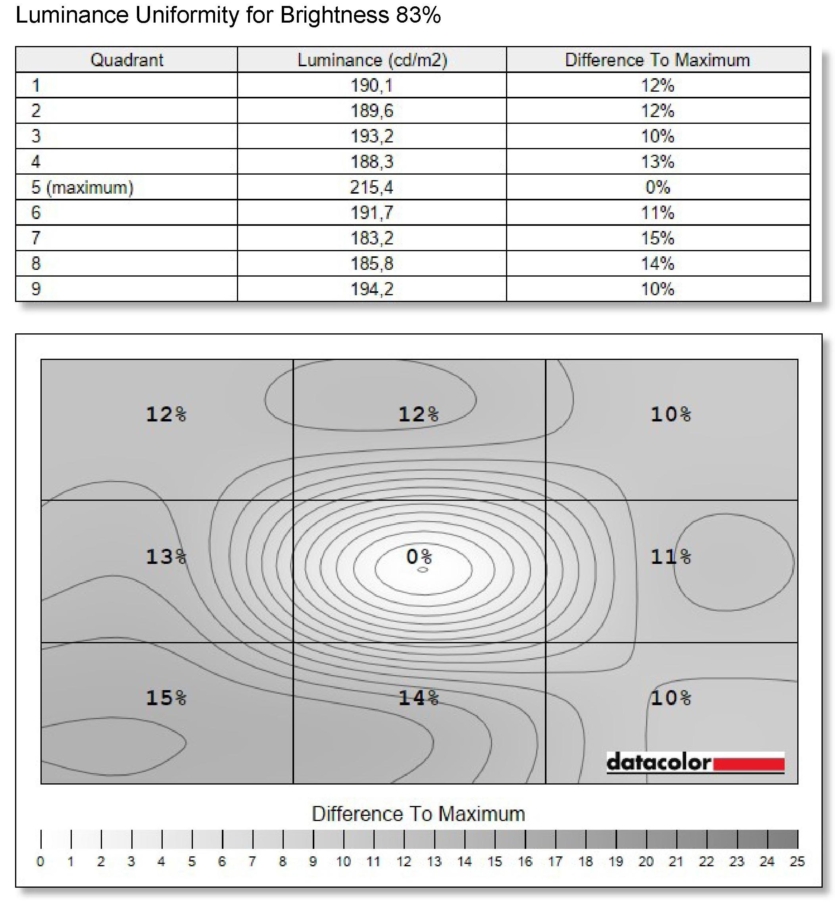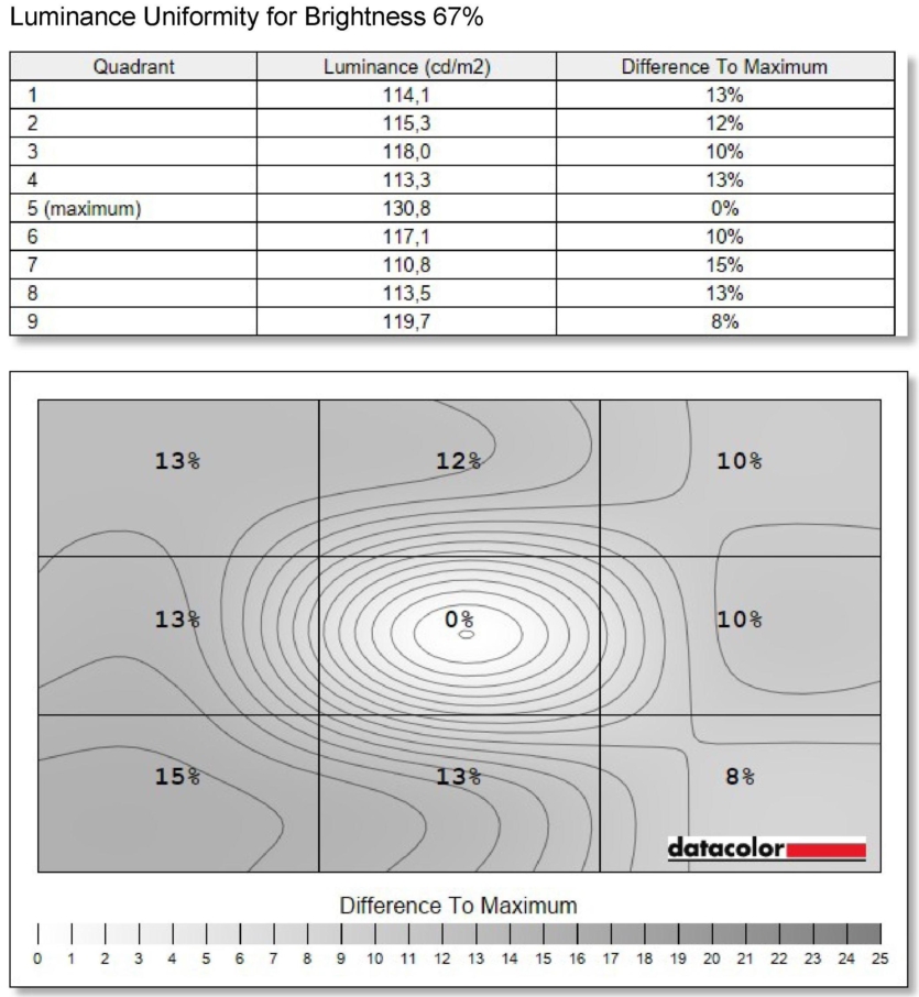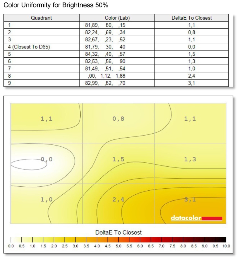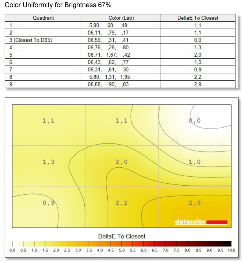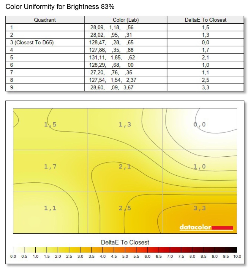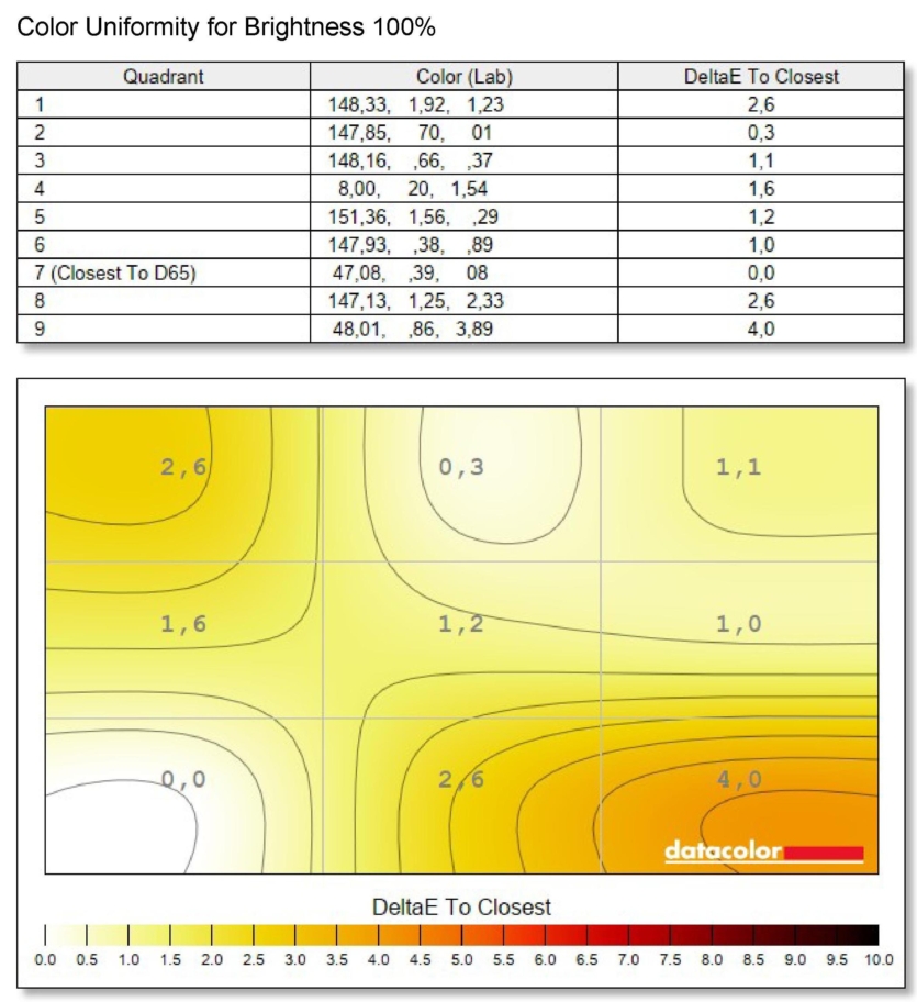 Что касается результатов различия цветовой температуры на разных участках дисплея, то имеем вполне неплохие результаты — максимальная ΔE=4.0 в правом нижнем углу на 100% яркости. С ее уменьшением расхождение опускается до лучших показателей.