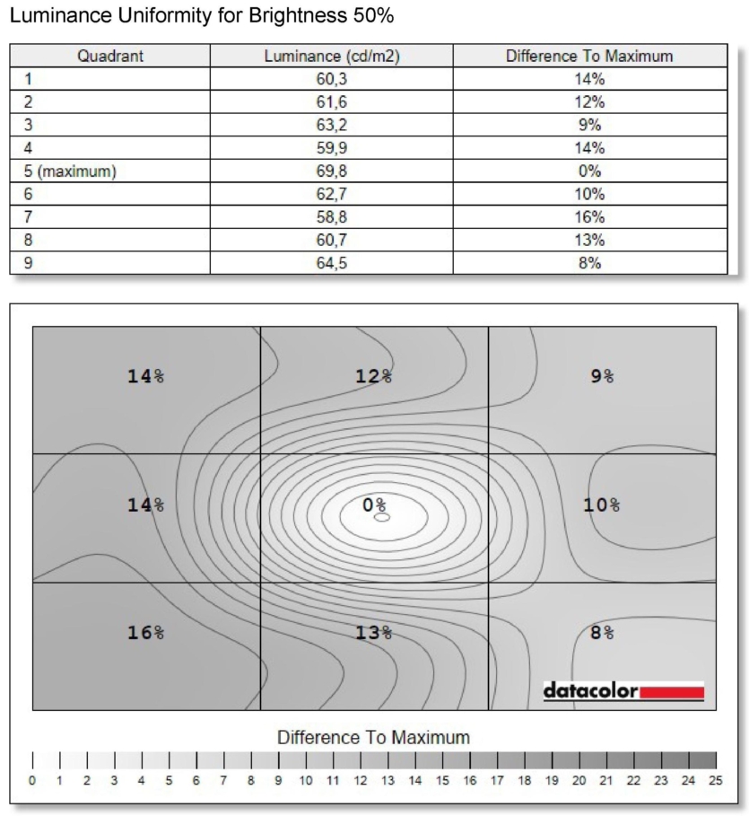 Равномерность белого поля находится в пределах нормы, как для IPS панели. Наибольшая яркость наблюдается в центральной части дисплея. В целом минимальная яркость при наименьшей подсветке составляет 58 кд/м².