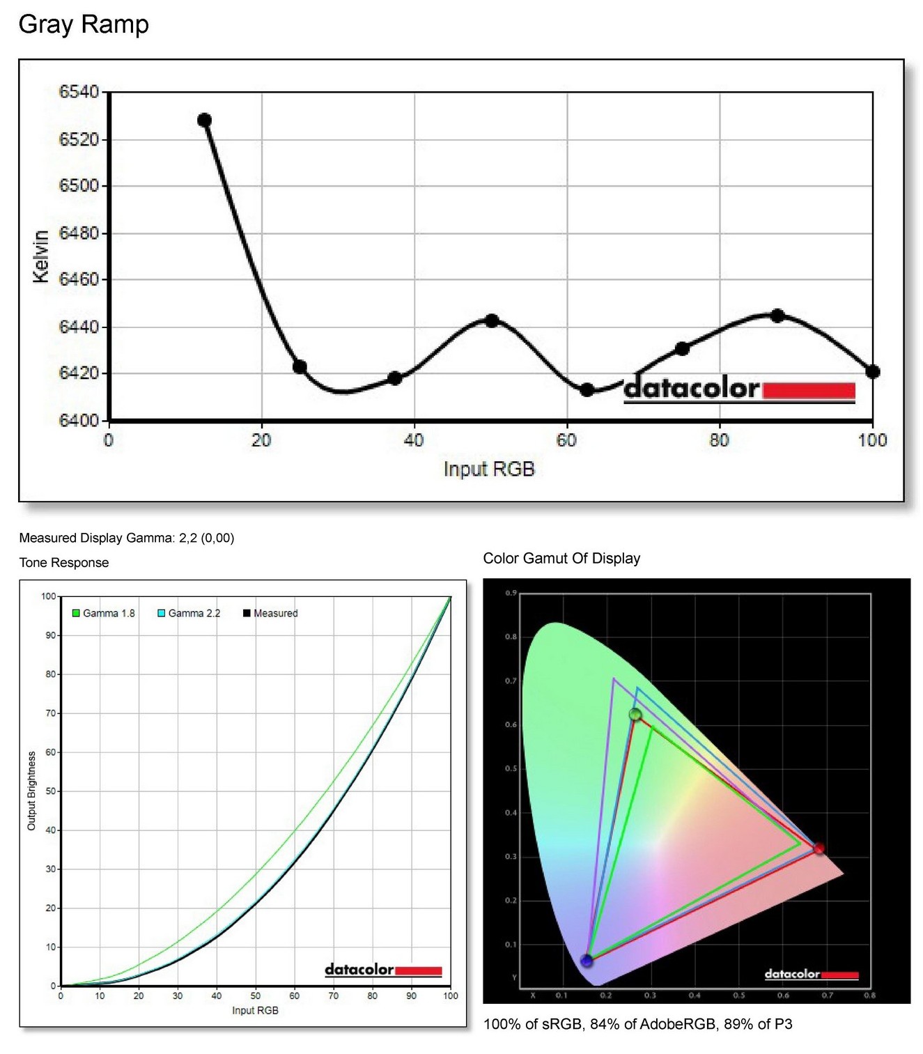 Стандартные замеры колориметром SpyderX Elite показывают меньшие, хотя и хорошие результаты, учитывая цену монитора: sRGB — 100% Adobe RGB — 84% и DCI-P3 — 89%. Картинка при этом выглядит приятно, без излишней перенасыщенности.