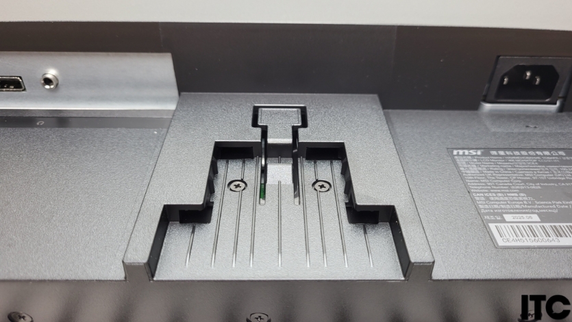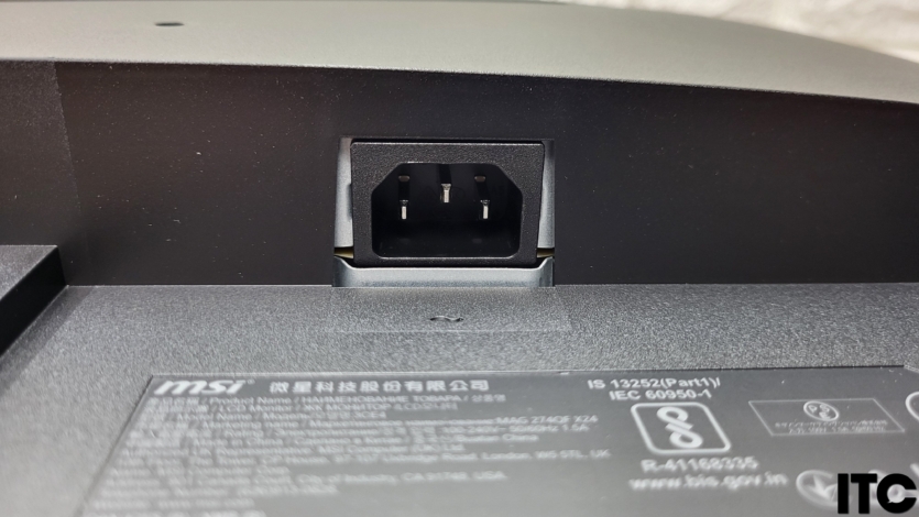 Монитор достаточно легкий. При габаритах самой панели (614 x 363 x 62 мм) он весит около 4.7 кг вместе с подставкой. Небольшая V-образная стойка сделана в геймерском стиле из пластика, с металлическим усилением снизу. Это типичное дизайнерское решение для серии MSI MAG. Блок питания здесь внутренний.