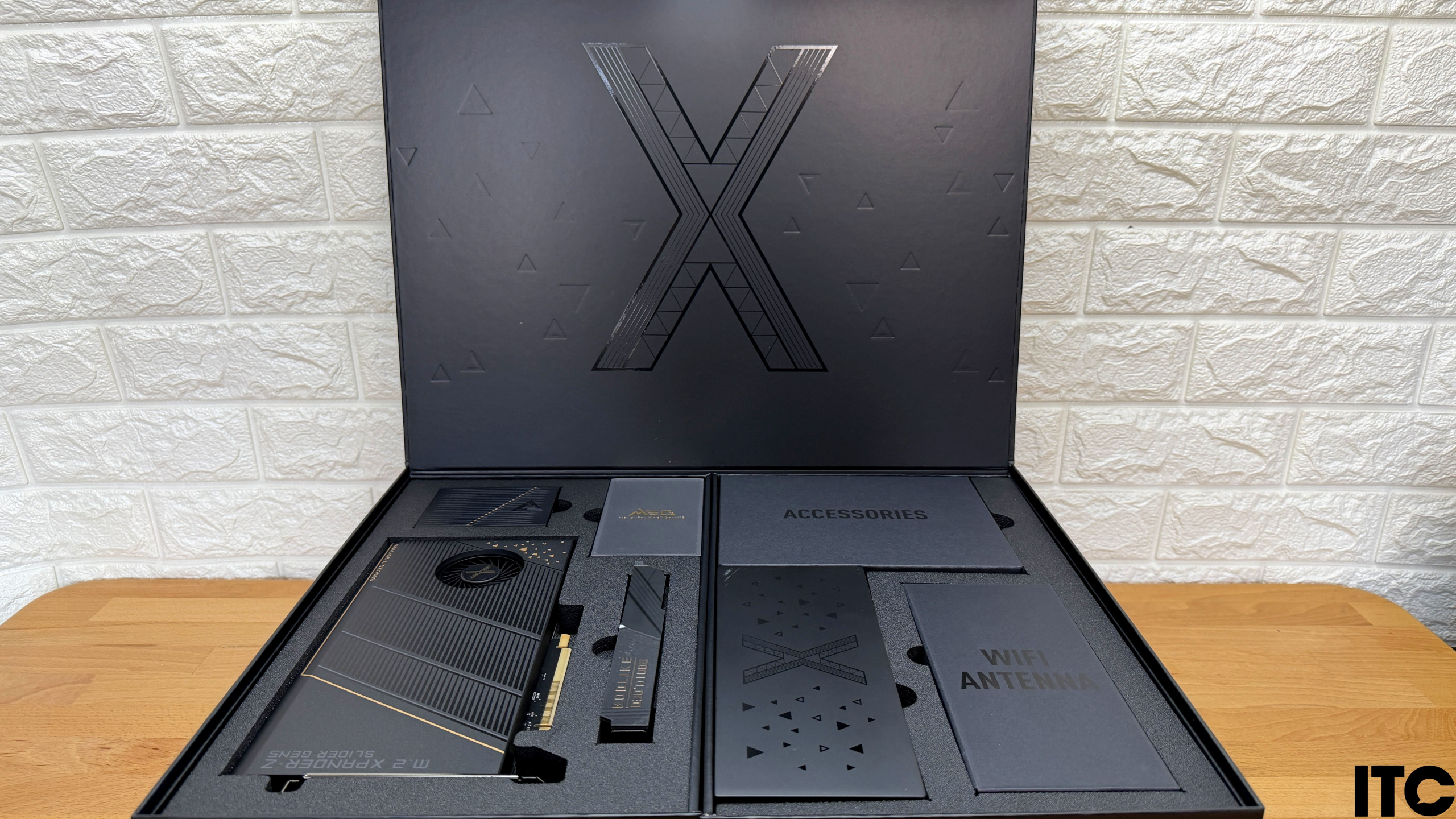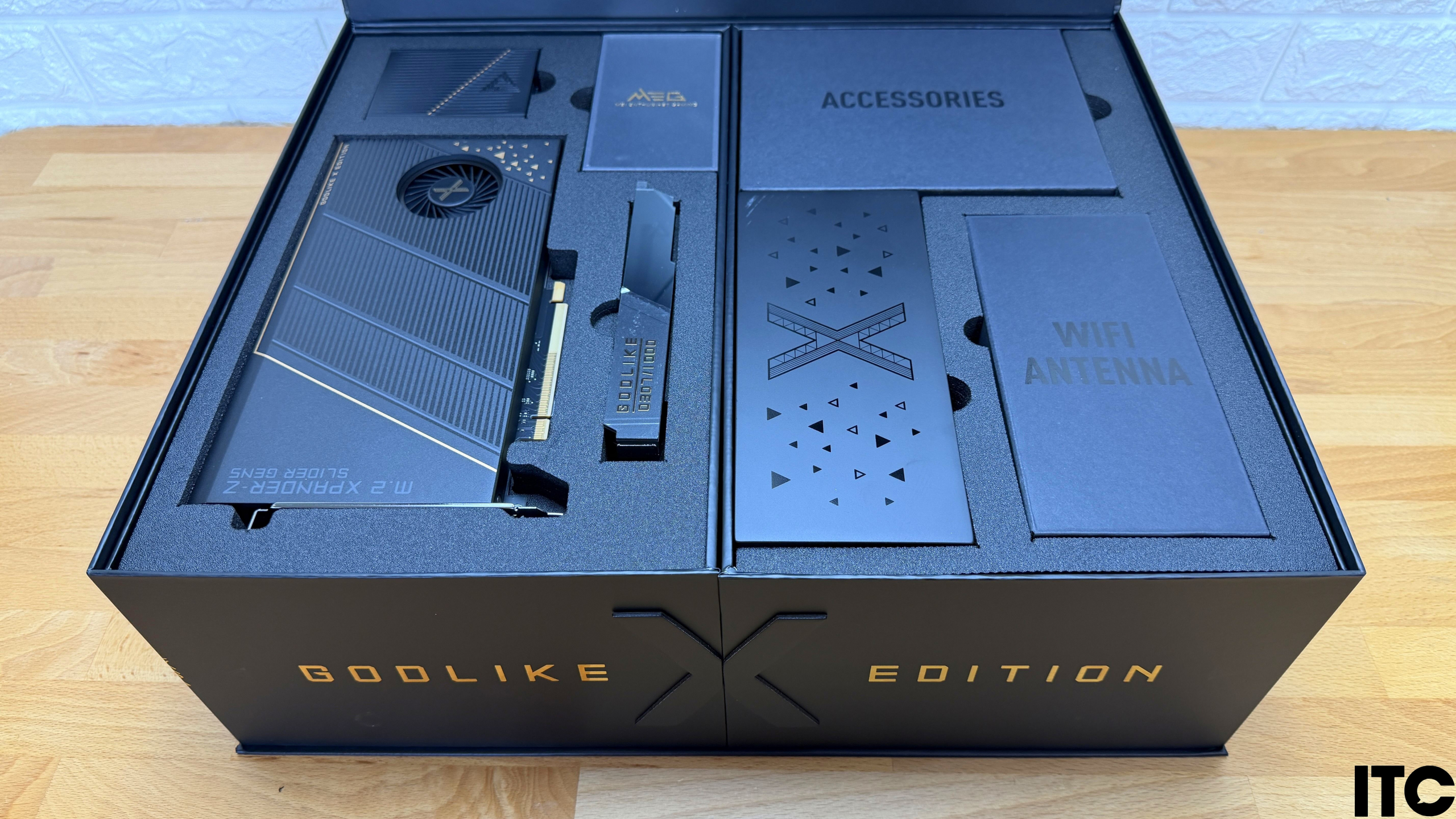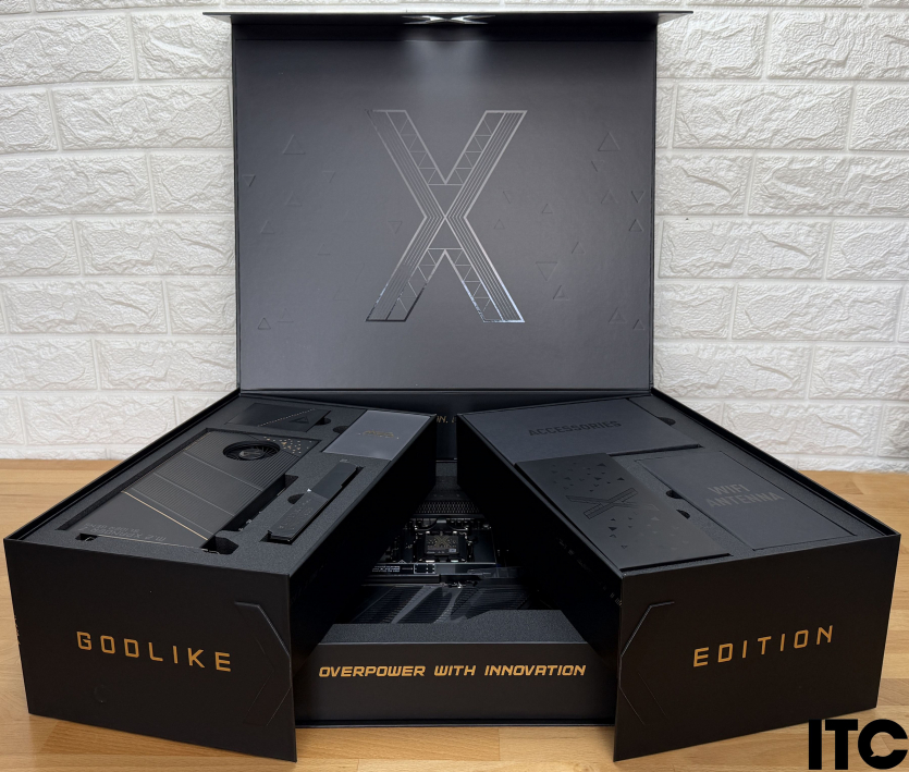 Две верхних секции раздвигаются в сторону как лепестки. В них находится настоящее ассорти дополнительных компонентов и аксессуаров. Сама же MSI MEG X870E Godlike X Edition важно зафиксирована в нижнем боксе.