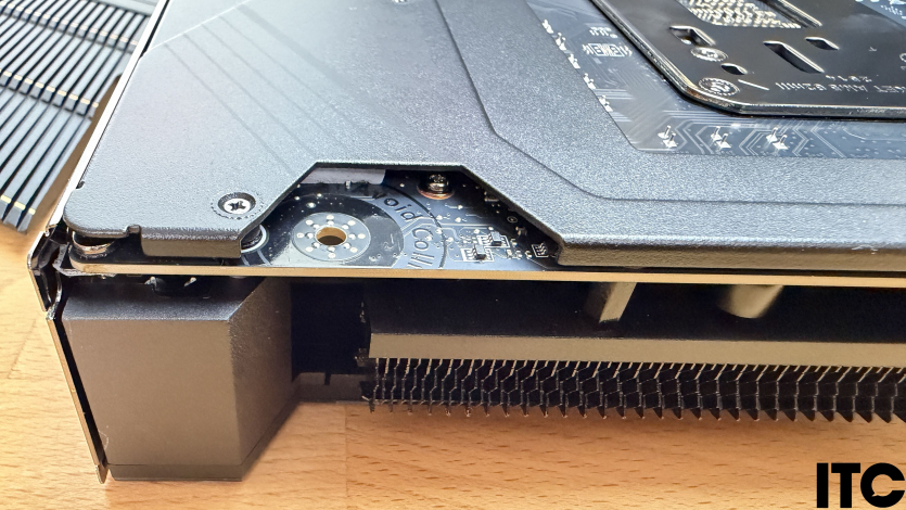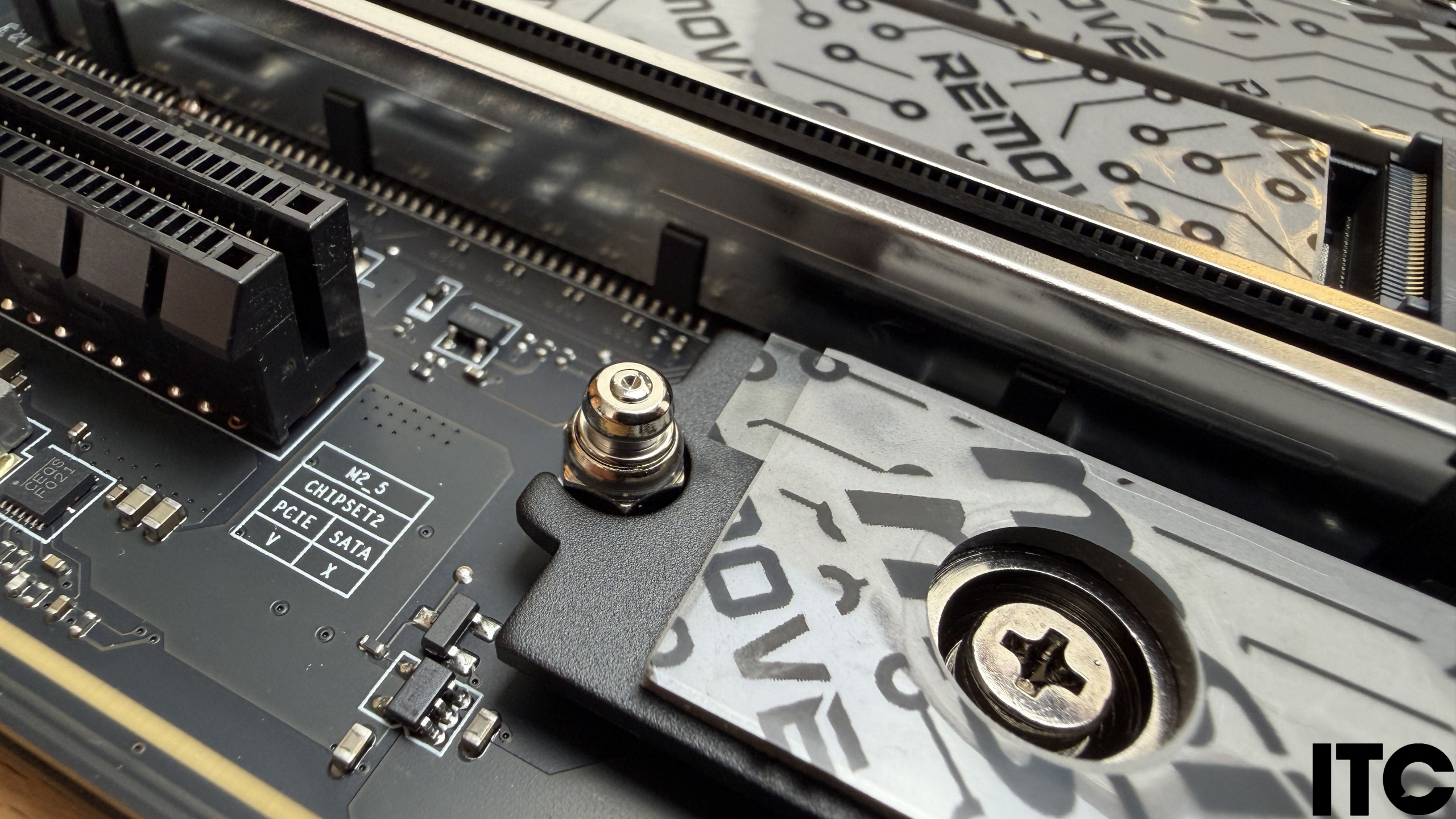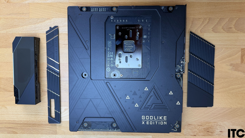 Нижняя часть материнской платы покрыта сплошным слоем быстросъемных радиаторов. Один из них (для M.2) — двусторонний. Треугольник (или пирамидка) функционально — увеличенный радиатор PCH, который в паре с задней панелью обеспечивает охлаждение чипсета X870E.
